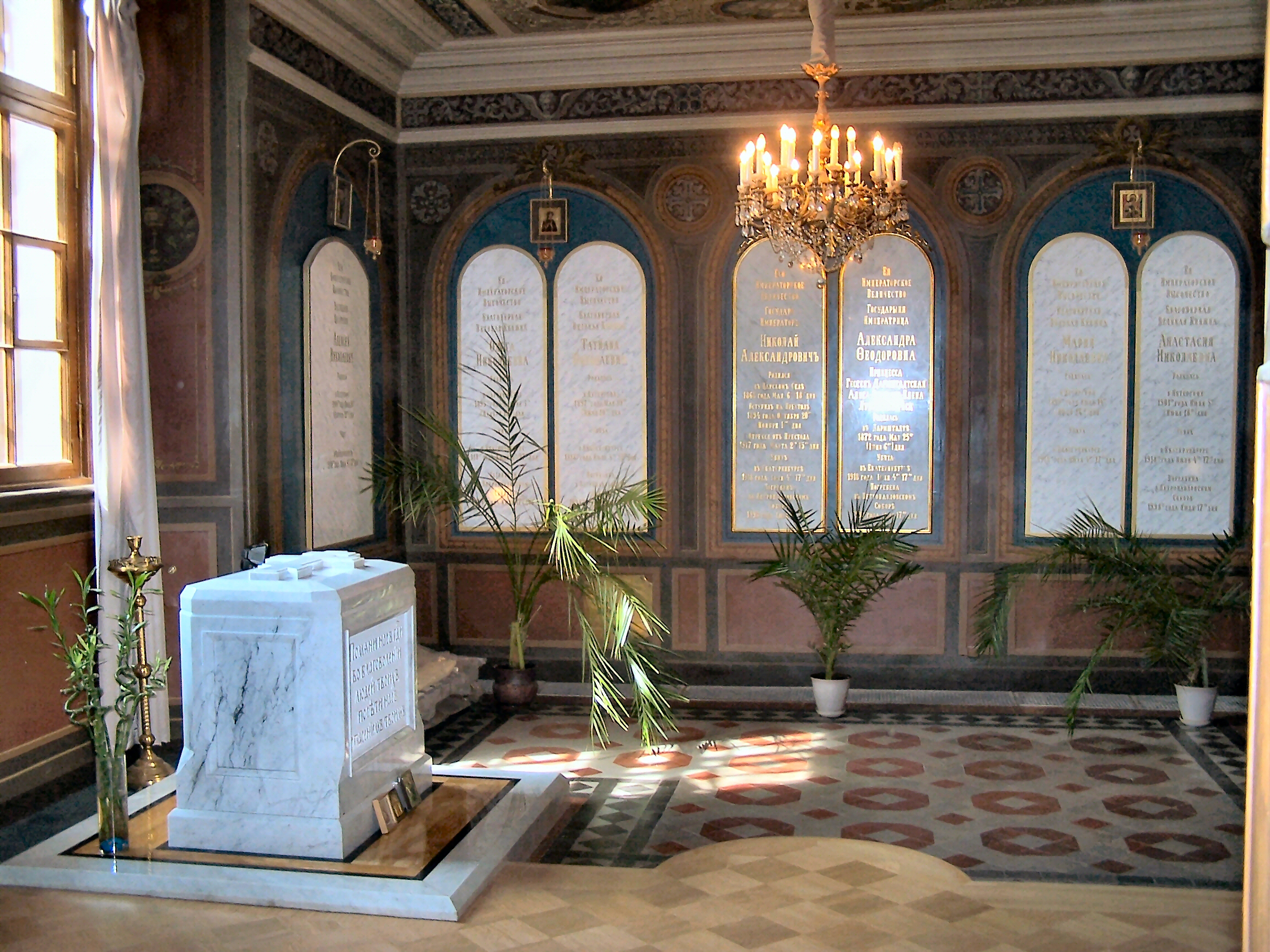 1991년 6월에 시신이 발굴된 후,[21] 예카테린부르크나 상트페테르부르크에 재매장해야 하는지에 대한 논쟁이 벌어지는 동안 1998년까지 연구소에 보관되었다. 위원회는 결국 상트페테르부르크를 선택했다. 유해는 예카테린부르크에서 상트페테르부르크로 완전한 군사적 명예 경례와 로마노프 가문 구성원의 호위를 받으며 이송되었다. 상트페테르부르크에서는 제국의 유해가 공항에서 상트페테르부르크의 성 베드로와 바울 대성당으로 공식적인 군사 명예 경례 행렬에 의해 옮겨졌으며, 그곳에서 그들(그들과 함께 살해된 충성스러운 하인 여러 명과 함께)은 조상의 무덤 근처 특별 예배당에 안치되었다. 대성당에서 남은 로마노프 가문은 니콜라이 2세를 위한 공식 장례식을 주최했으며, 많은 친척과 전 세계 국가의 대표가 참석했다.[22]