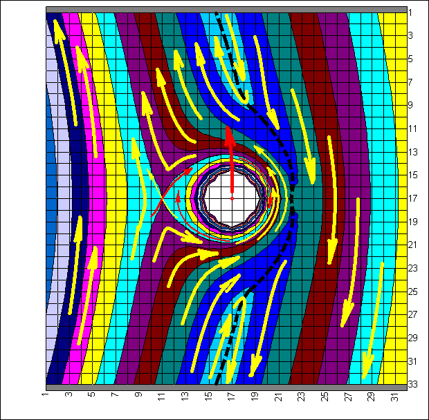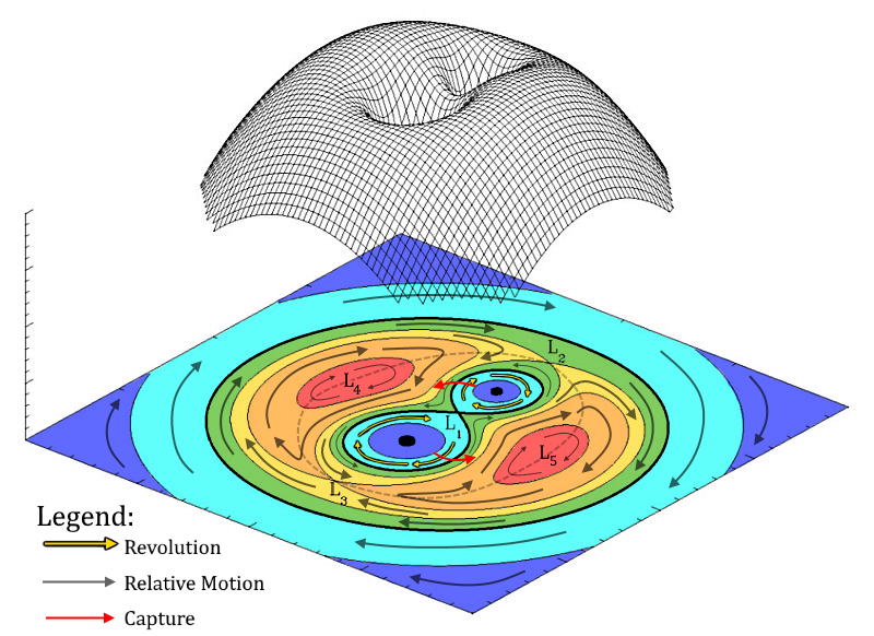 중력 퍼텐셜 그림에서 L1, L2, L3, L4, L5는 시스템과 함께 회전하는 라그랑주 점을 나타낸다. 빨간색, 주황색, 노란색, 녹색, 하늘색, 파란색 영역은 높은 곳에서 낮은 곳 순서로 퍼텐셜 배열을 나타낸다. 빨간색 화살표는 시스템의 회전을, 검은색 화살표는 파편의 상대적인 움직임을 나타낸다.