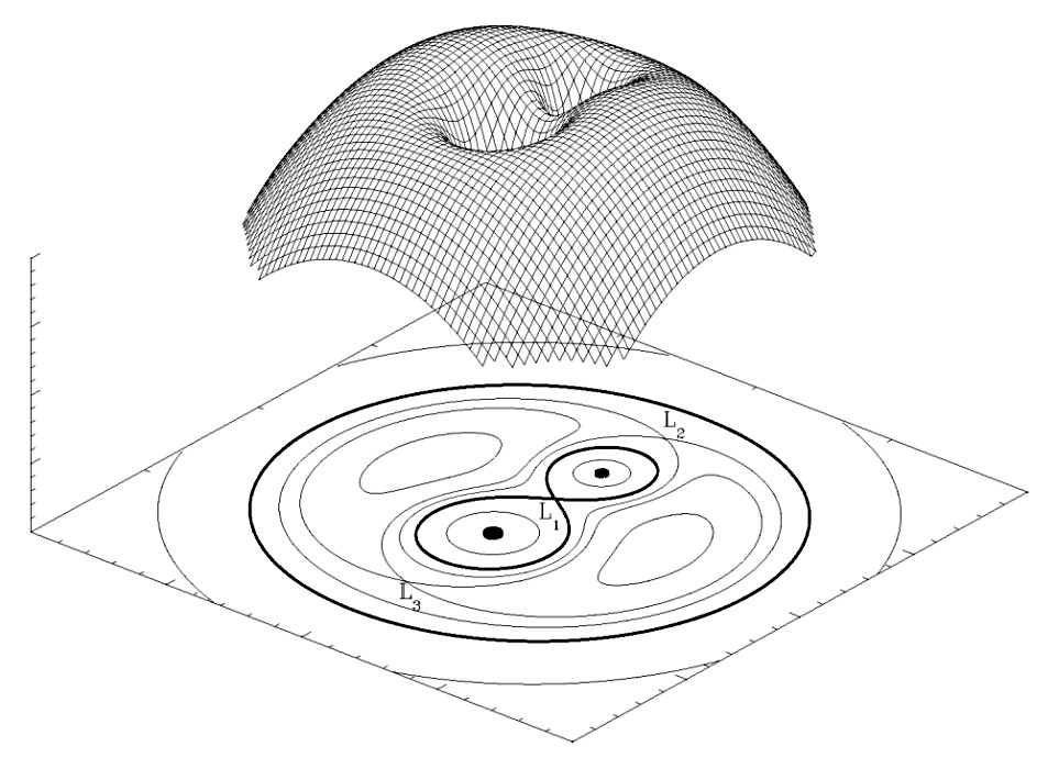 쌍성계의 로슈 퍼텐셜을 3차원으로 표현한 그림