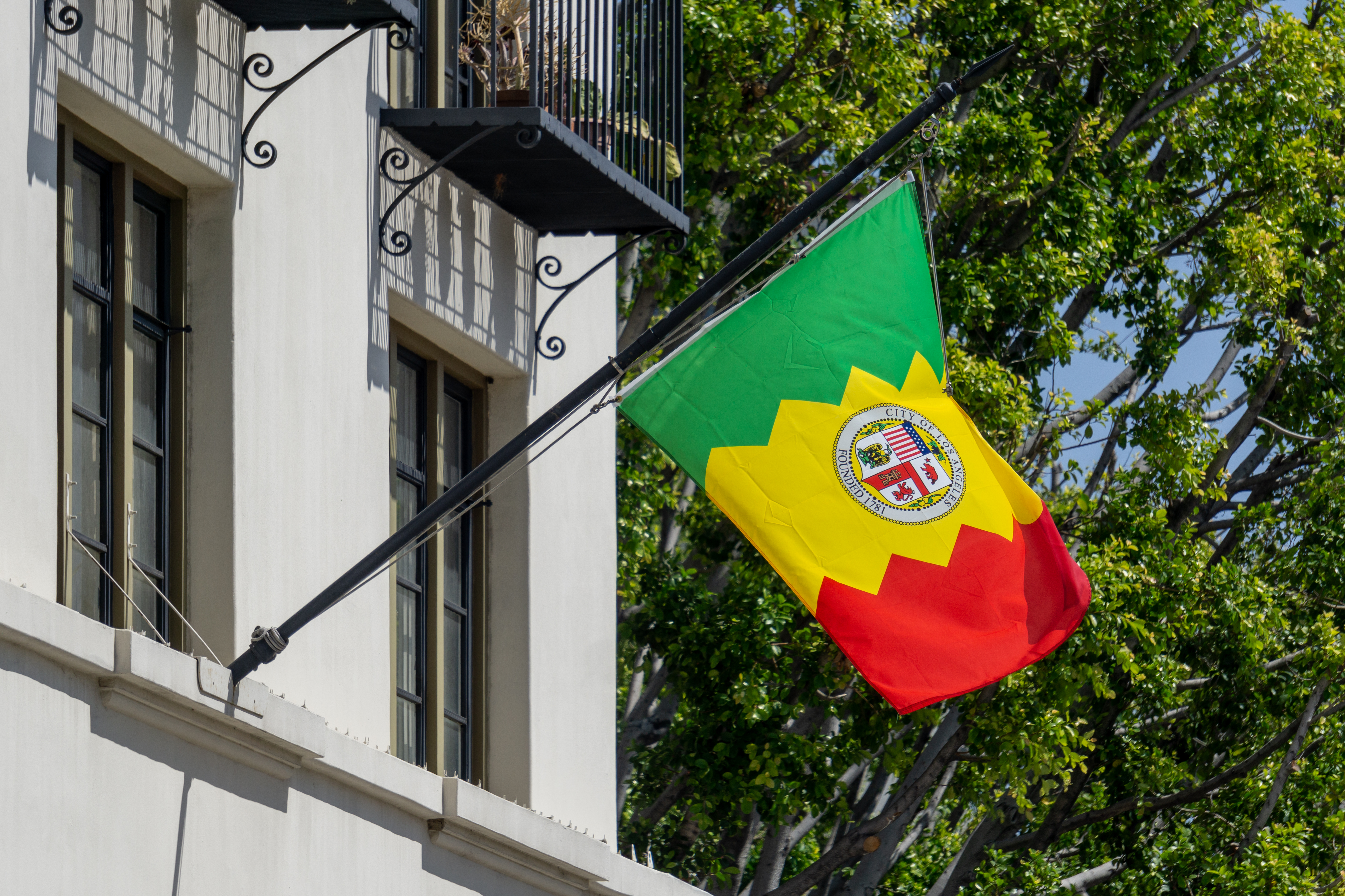 디자인초록색(왼쪽), 노란색(가운데), 빨간색(오른쪽)의 세로 삼색기이며, 각 색상은 지그재그 모양의 가장자리를 가지고 있고, 중앙에는 로스앤젤레스 시의 문장이 위치함