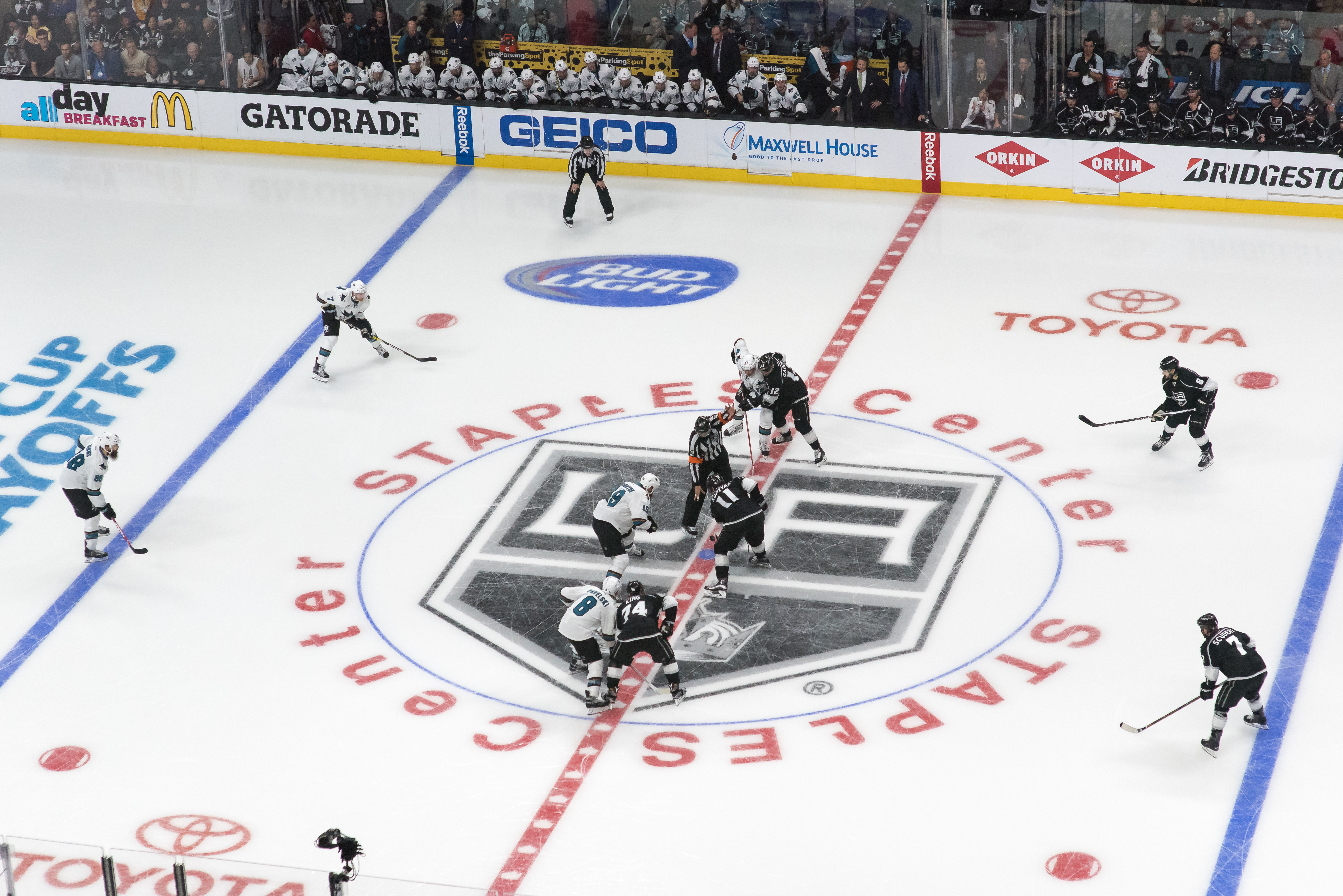 페이스오프 중인 킹스와 샌호세 샤크스. 2016 스탠리 컵 플레이오프 1라운드 5차전 경기 장면.