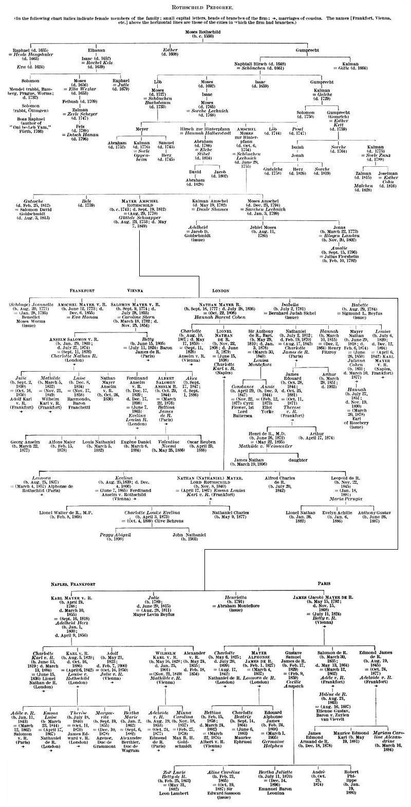 '로스차일드'라는 가문의 이름은 옛 독일어로 '붉은 방패'를 의미하며, 가문이 대대로 살던 저택의 모습에서 유래했다.[284] 이 붉은 방패는 로스차일드 가문의 문장 한가운데에 여전히 남아있다. 1744년 독일 프랑크푸르트의 유대인 지역에서 마이어 암셀 로스차일드가 태어나면서 가문은 비약적인 발전을 시작했다.