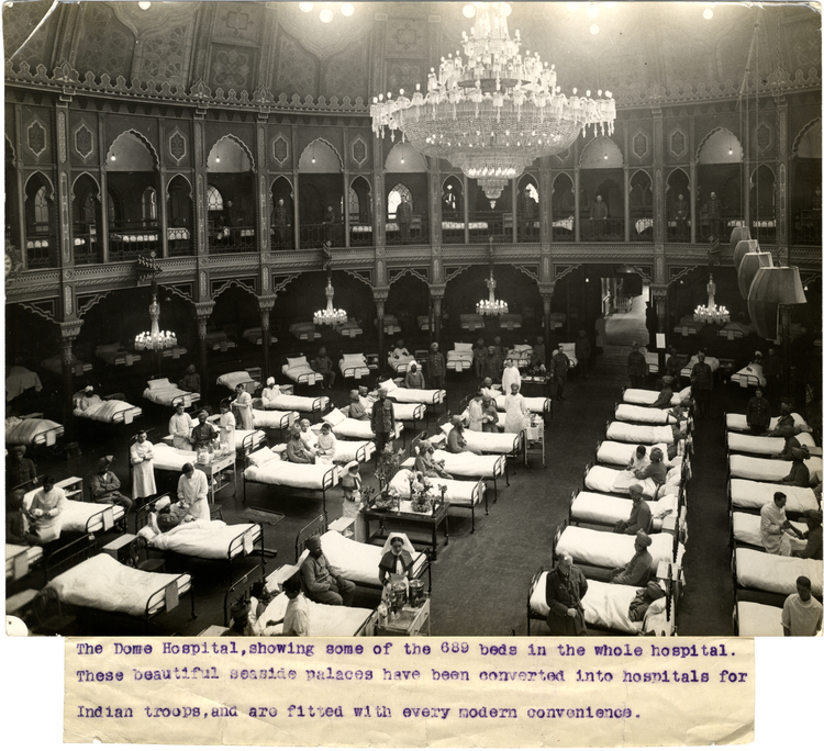 제1차 세계 대전 동안, 로열 파빌리언은 브라이튼의 다른 장소들과 함께 군 병원으로 개조되었다.[9] 1914년 12월부터 1916년 1월까지, 인도군의 아프고 부상당한 병사들이 이곳에서 치료를 받았다. 쿠다다드 칸, 샤하마드 칸, 미르 다스트와 같이 많은 빅토리아 십자 훈장 수여자들이 이곳에서 치료를 받았다. 파빌리언 병원은 인접한 과 콘 익스체인지까지 포함하여 운영되었는데, 이 건물들은 과거 왕실 마구간 단지의 일부였다.