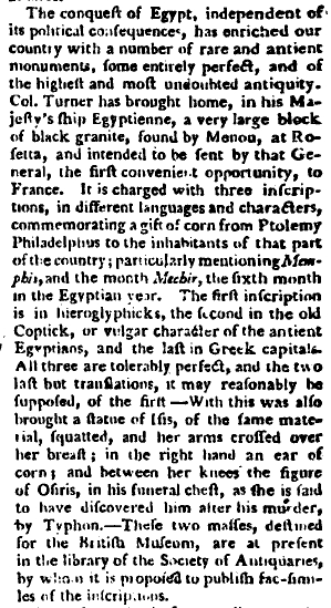 나폴레옹이 이끄는 프랑스군은 1798년 이집트를 침공했다. 1801년 3월, 영국군은 아부키르만에 상륙했고, 프랑스군은 수세에 몰렸다. 자크-프랑수아 메누 장군이 이끄는 프랑스 원정대는 로제타석을 포함한 많은 유물을 싣고 북쪽으로 이동했으나, 전투에서 패배하고 알렉산드리아로 후퇴했다. 로제타석은 알렉산드리아 안에 있었고, 메누는 1801년 8월 30일에 항복했다.[43]