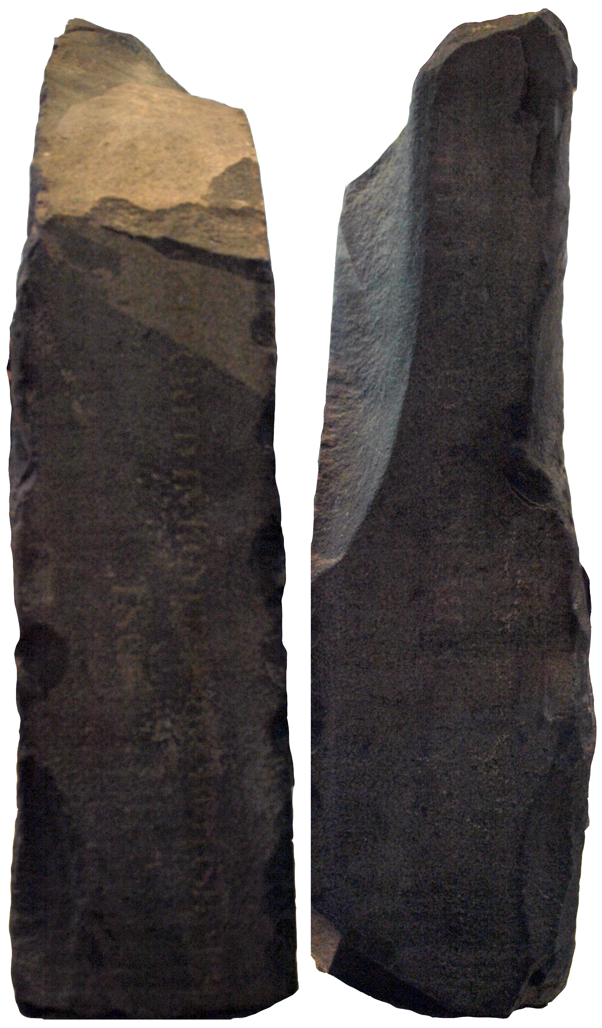 이 돌에는 세 가지 문자가 새겨져 있는데, 동일한 내용을 서로 다른 세 종류의 문자로 기록하여 다양한 사람들이 읽을 수 있도록 하였다. 비문은 얕게 새겨져 있고, 돌의 측면은 매끄럽지만 뒷면은 거칠게 처리되어 있는데, 이는 비석이 세워졌을 때 뒷면이 보이지 않았기 때문으로 추정된다.[5][10]