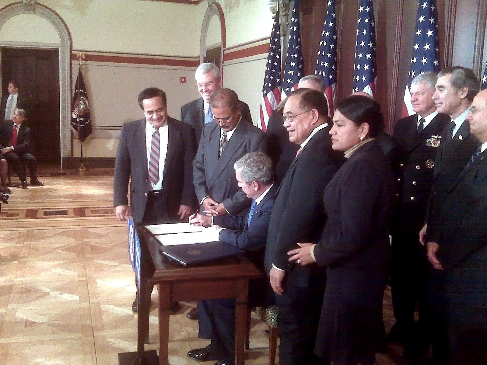 조지 W. 부시 대통령이 2009년 1월 6일 로즈 환초 해양 국립 기념물 설립 서류에 서명하는 모습.