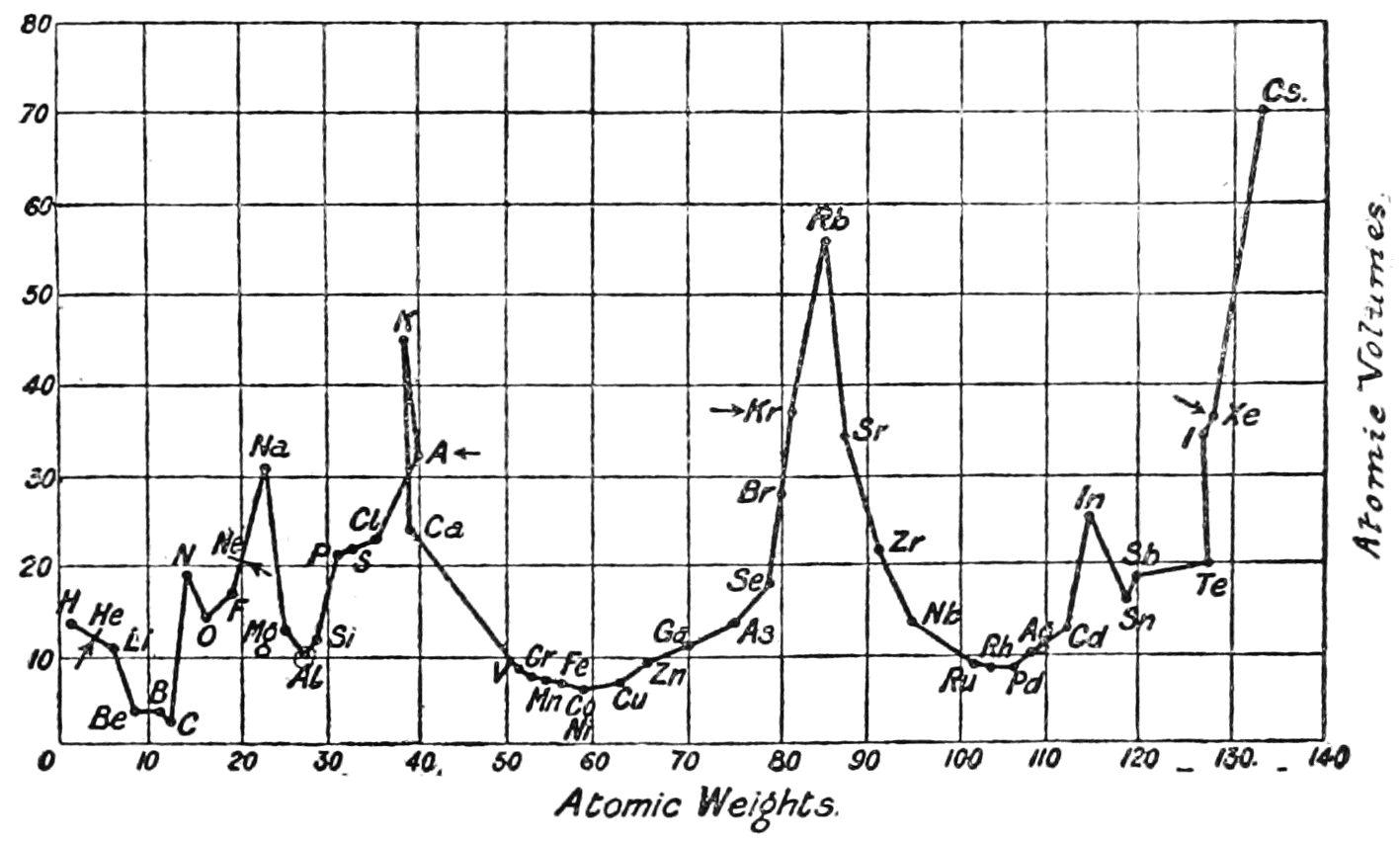 1901년 PopSci 잡지에 실린 유사한 그래프 (마이어 시대에는 화살표로 표시된 비활성 기체가 발견되지 않았다.)