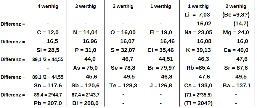 아래는 마이어가 1864년에 제시한 주기율표이다.[4]