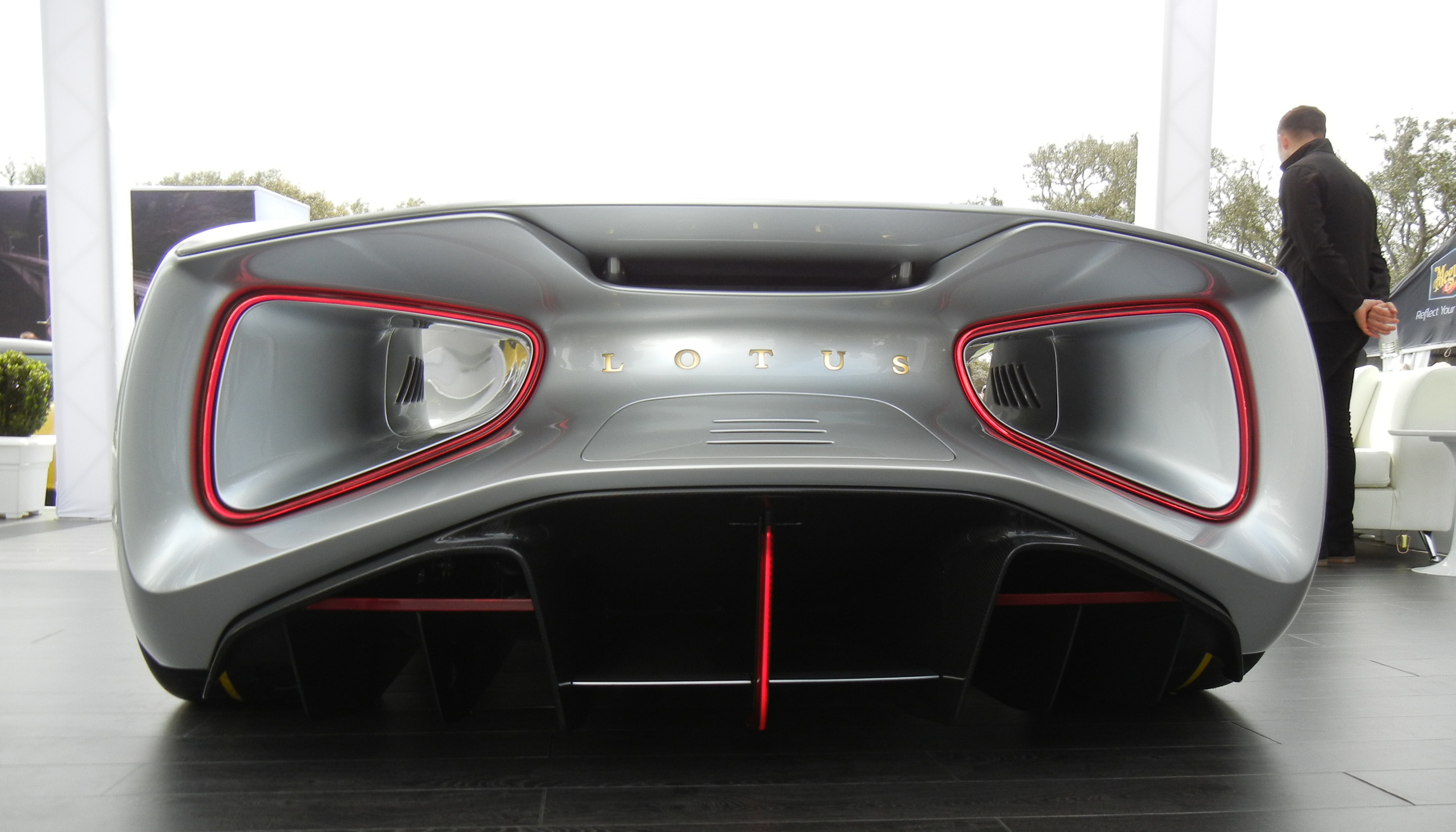 프론트에는 바이플레인(복엽) 스플리터를 장착하여 중앙 부분에서 배터리 팩 및 프론트 액슬을 냉각하기 위한 공기를 흡입한다. 프론트 중앙 섹션 및 사이드 윙에는 로터스가 과거에 개발한 포뮬러 1 자동차 "72"에 대한 오마주가 담겨 있다.[18] 헤드라이트는 양산차로서는 세계 최초로 하이빔과 로우빔 모두에 레이저를 채용했다. 라이트 형태는 얇고 세로로 길며, 이후 발표된 에미라도 동일한 디자인을 하고 있다.
