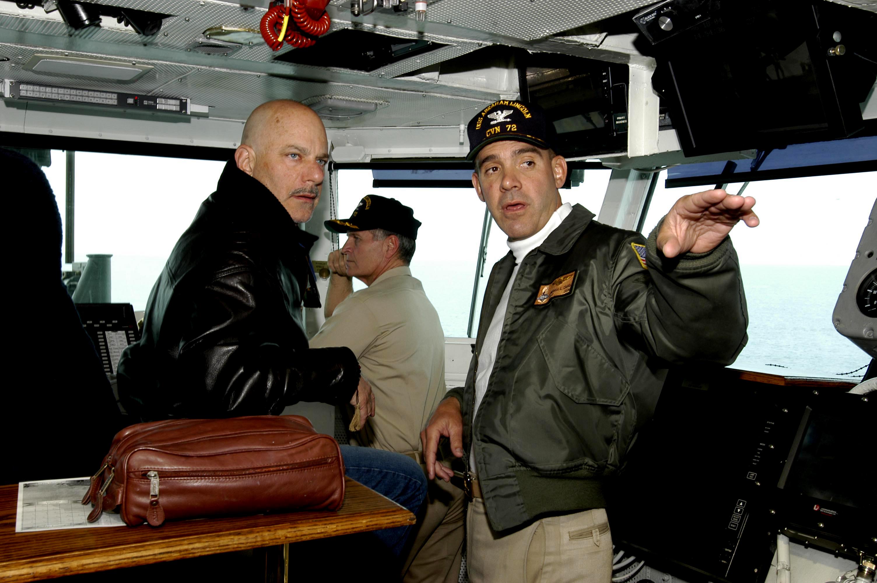 롭 코언(왼쪽)과 항공모함 에이브러햄 링컨 함내(2004년)