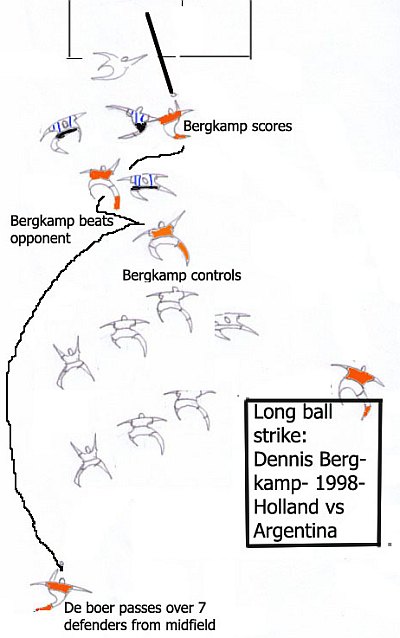 1998년 FIFA 월드컵에서 네덜란드 공격수 데니스 베르캄프가 아르헨티나를 상대로 넣은 골은 롱볼의 위력을 보여주는 대표적인 사례이다.[29] 프랑크 데 부르는 필드 중앙 부근에서 7명의 상대 선수를 넘기는 긴 패스를 보냈고, 베르캄프는 이 공을 받아 수비수를 제치고 골을 넣었다.[29] 이는 롱볼이 단순히 공을 앞으로 차는 것이 아니라, 높은 수준의 기술과 창의성이 필요함을 보여준다.[29]