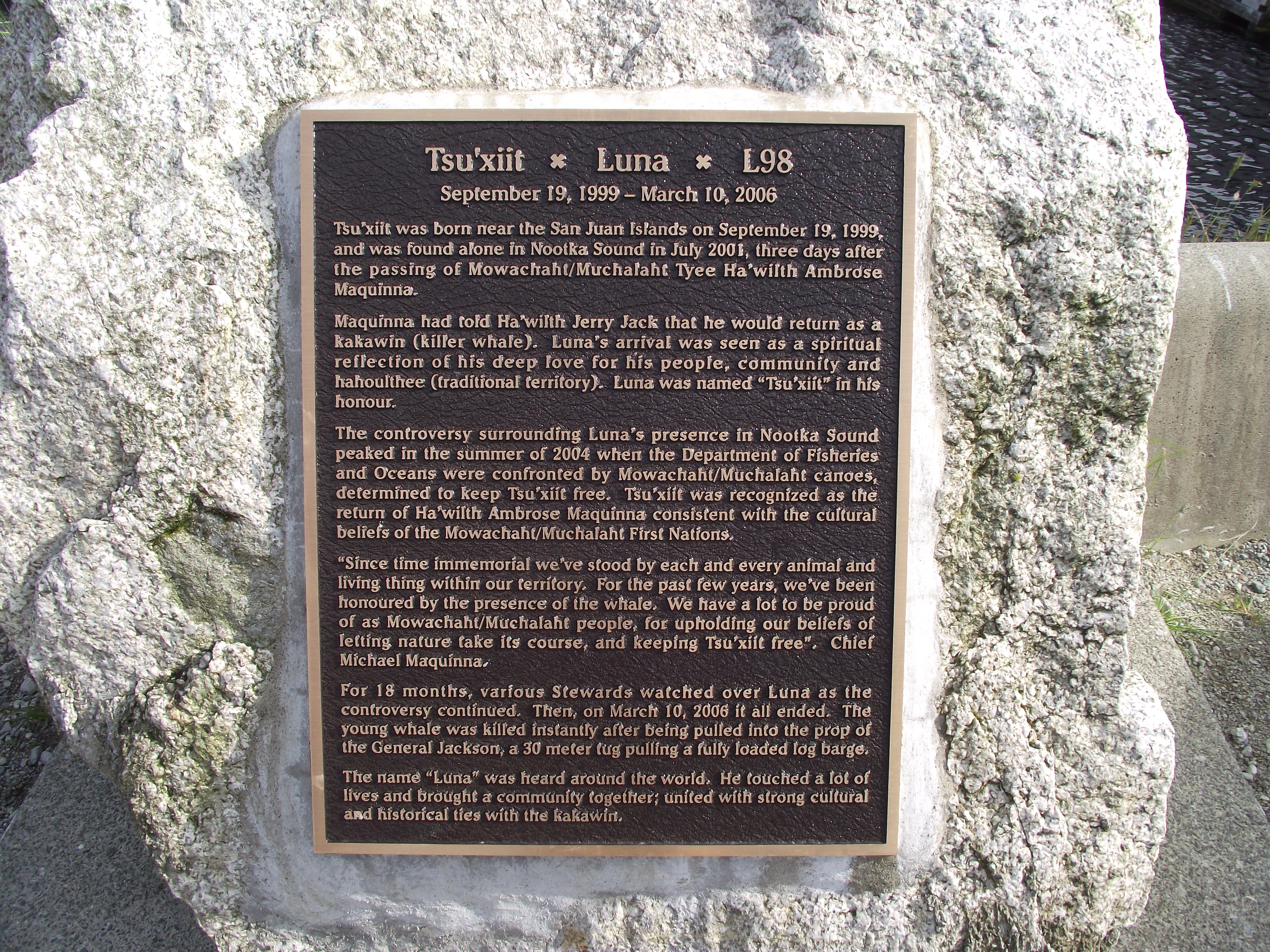 2002년부터 2006년까지, 미국 워싱턴주 퓨젓사운드 만 출신으로 추정되는 범고래 루나(L98)를 보호하고 그의 무리로 돌려보내기 위한 관리 프로그램이 진행되었다.[22][1] 루나는 한 살 때 무리에서 떨어져 나와 밴쿠버섬 서쪽 누트카 해협 근처에서 홀로 지냈는데, 호기심이 많아 배를 따라다니는 행동 때문에 안전 문제가 꾸준히 제기되었다.[22]