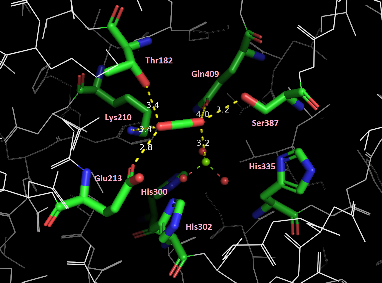 이산화 탄소(CO2)와 효소 촉매 작용에 관여하는 잔기가 표시되어 있다.