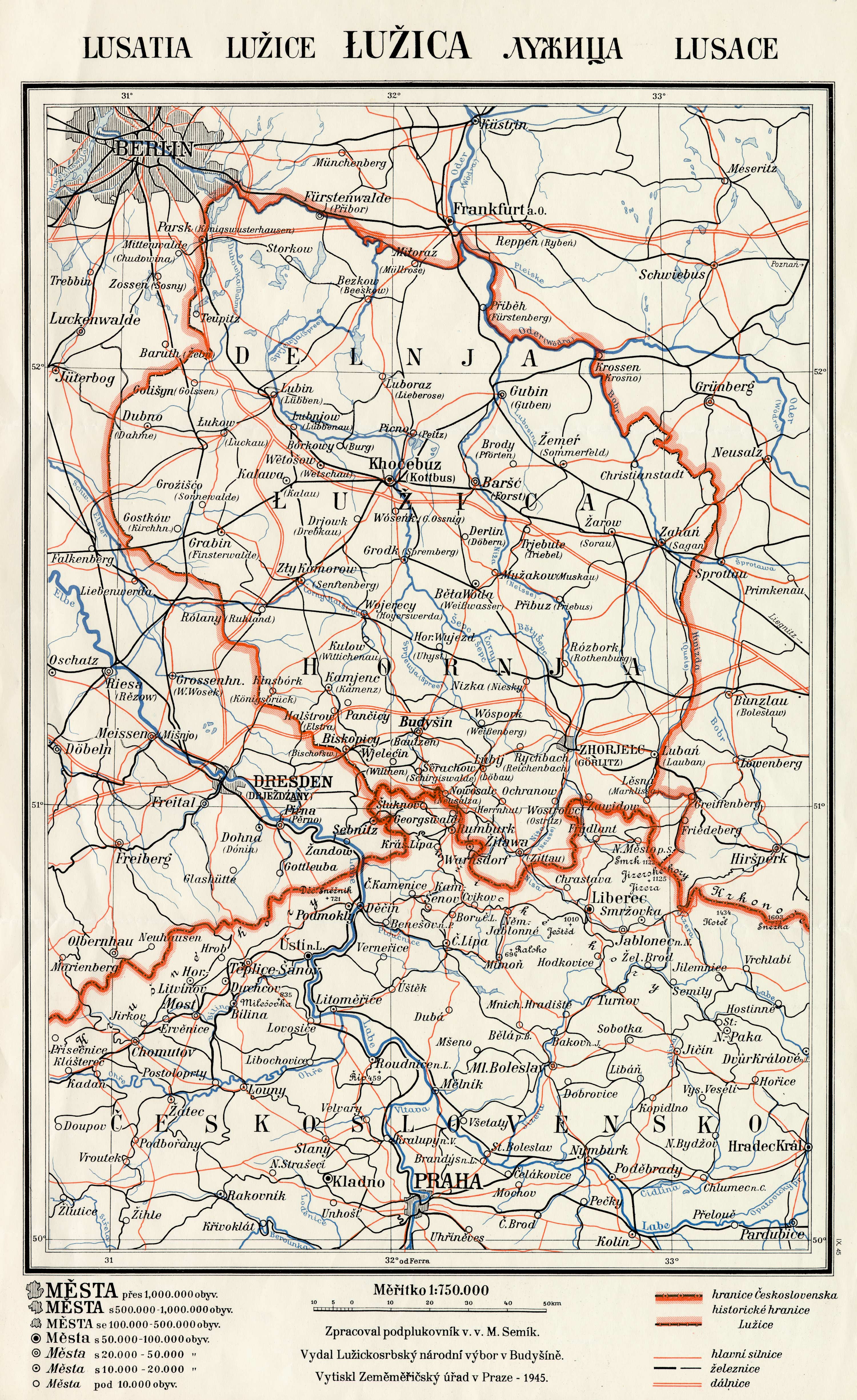 포츠담 협정에 따라 제2차 세계 대전 이후 루사티아는 연합국 점령 하의 독일(소련 점령 지역)과 폴란드 인민 공화국 사이의 오데르-나이세 선을 따라 분할되었다. 폴란드의 공산 정부는 포츠담 협정에 따라 1945년과 1946년에 나이세 강 동쪽 지역에서 남아 있던 모든 독일인과 소르브인을 추방했다. 프라하의 루사티아 민족 위원회는 자치권과 독일로부터의 분리, 루사티아 자유국의 창설 또는 체코슬로바키아와의 합병을 주장했다. 그러나 소르브 지식인 대다수는 도모비나에 조직되어 독일로부터 분리되기를 원치 않았다. 루사티아 민족 운동에 의해 주장된 주장은 루사티아를 폴란드 또는 체코슬로바키아에 합병하자는 것이었다. 1945년에서 1947년 사이에 그들은 미국, 소련, 영국, 프랑스, 폴란드, 체코슬로바키아에 약 10개의 기념물을 제작했지만,[18] 이는 아무런 결과를 가져오지 못했다. 1946년 4월 30일, 루사티아 민족 위원회는 또한 폴란드 정부에 파벨 치시 - 폴란드 장관이자 공식 소르브 대표가 서명한 청원을 제출했다. 루사티아 자유국을 선포하려는 계획도 있었는데, 이 자유국의 총리는 루사티아 출신의 폴란드 고고학자 보이치에흐 코치카가 맡을 예정이었다.