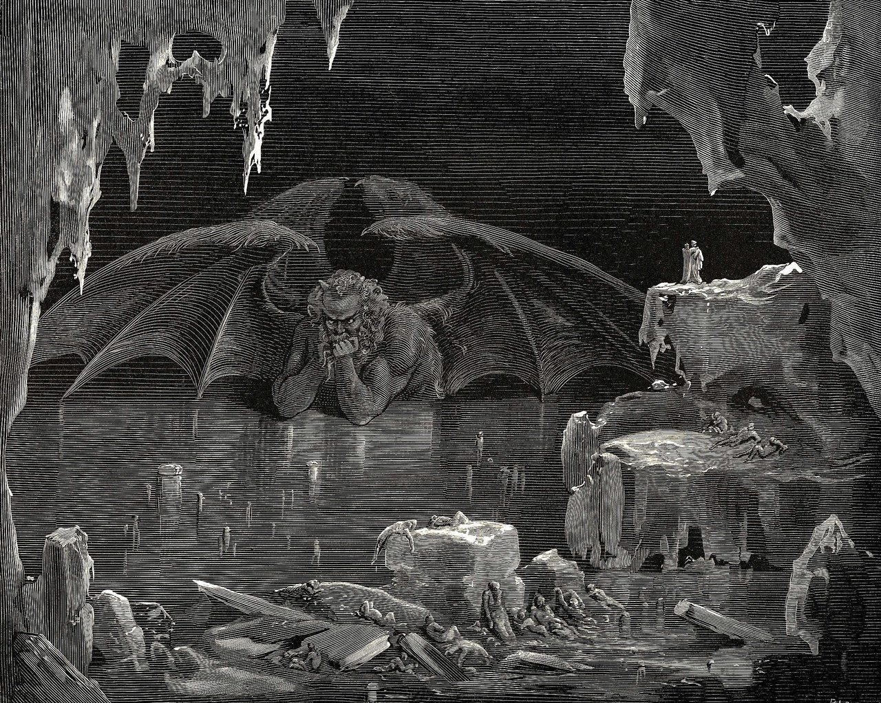 루키페르가 지상에 충돌하는 순간 심한 충격으로 거대한 균열이 생겼으며, 루키페르는 죄의 무게 때문에 지구 중심까지 빠져 들어갔다. 그곳은 얼음으로 뒤덮인 불모의 땅이었는데, 루키페르가 그 얼음 속에 갇힘으로써 지옥이라는 장소가 생겨났다. 루키페르의 격돌로 거대한 구멍이 생겼기 때문에 지표에 내던져진 흙이 연옥의 산이 되었다고 단테는 설명한다.