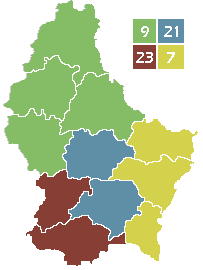 선거를 위해 룩셈부르크는 전국을 4개의 선거구로 나누며, 각 선거구의 인구수에 따라 의원 정수가 배분된다. 선거구별 의석 수는 남부 23석, 중부 21석, 북부 9석, 동부 7석이다.