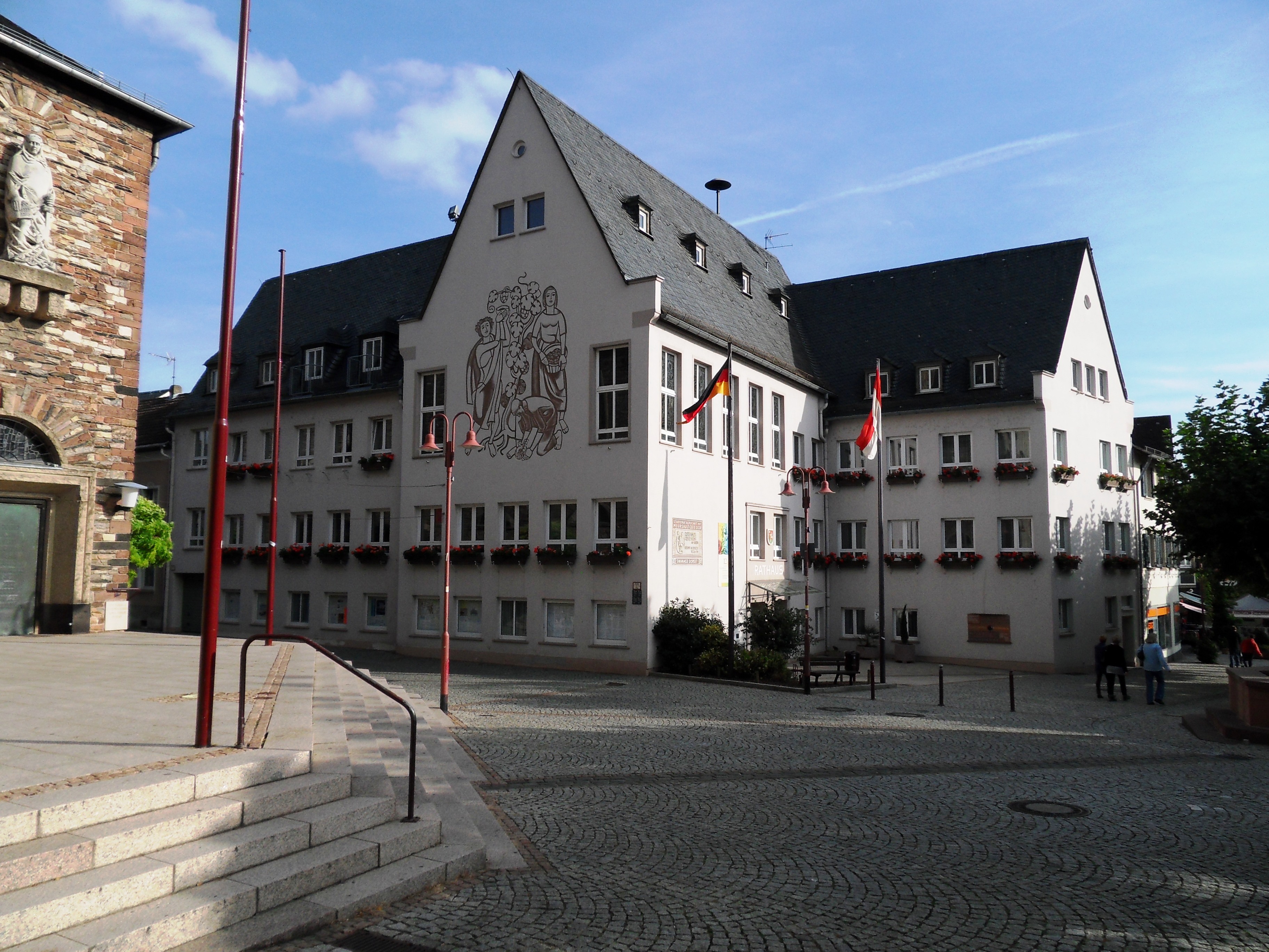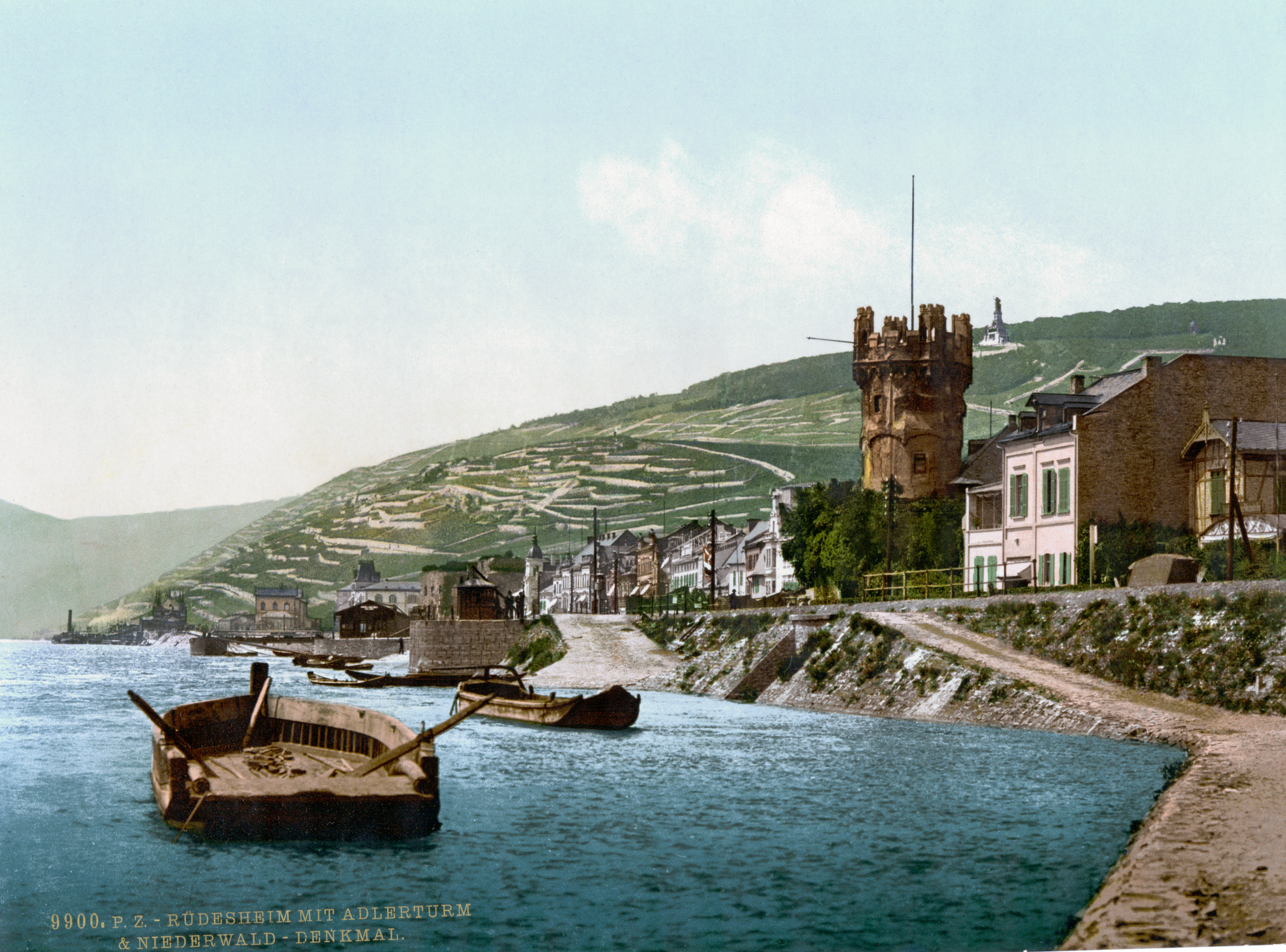 1877년, 포도밭 위에 니더발트 기념비(Niederwalddenkmal)의 첫 기초석이 놓였고, 1883년에 완공되었다. 톱니바퀴 철도를 이용해 이곳을 찾는 관광객이 많아졌다. 오늘날에는 곤돌라 리프트가 관광객을 기념비까지 운송한다. 관광업은 소득원으로서 선박 운송을 대체하고 있다.