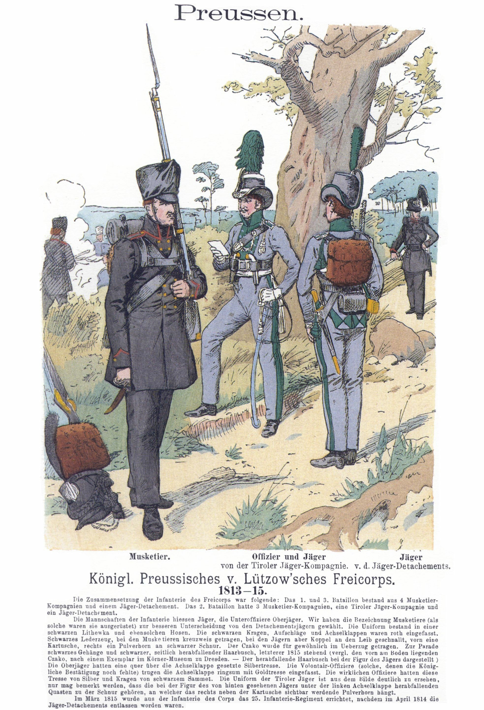 - 아돌프 폰 뤼초: 뤼초 자유군단의 지휘관이다. 1813년 1월 29일, 프리드리히 루트비히 얀과 프리드리히 프리젠이 브로츠와프(브레슬라우)의 집합 장소에 도착하여 지원병 모집 및 준비를 마친 후, 뤼초는 2월에 공식 승인을 받아 자유군단을 창설했다.[1] 1815년 리니 전투에서 중상을 입고 포로가 되었다.[1]