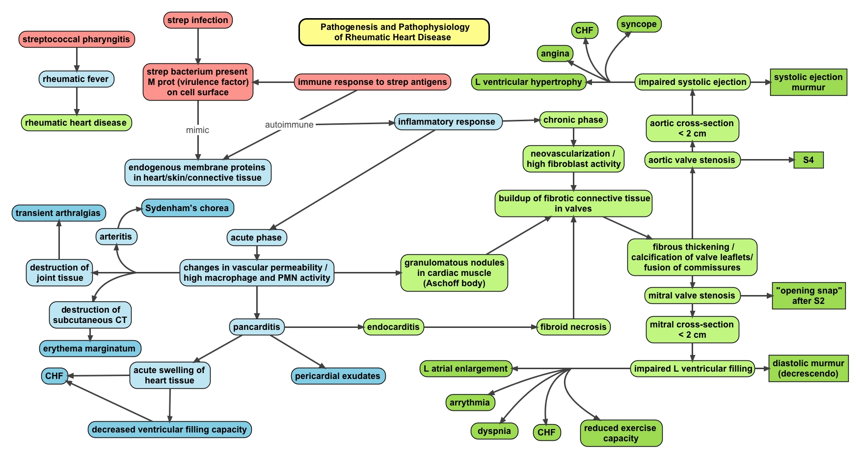만성 류마티스 심장 질환(RHD)은 섬유성 복구와 함께 반복적인 염증이 특징이다. 이는 A군 β-용혈성 연쇄상구균(GAS)에 대한 자가면역 반응으로 인해 발생하며, 이는 판막 손상을 초래한다.[17] RHD의 복잡한 발병 기전은 완전히 이해되지 않았지만, A군 연쇄상구균 탄수화물을 통한 분자 모방과 유전적 소인이 HLA Class II 유전자를 포함하여 자가면역 반응을 유발하는 것으로 관찰되었다.[20]
