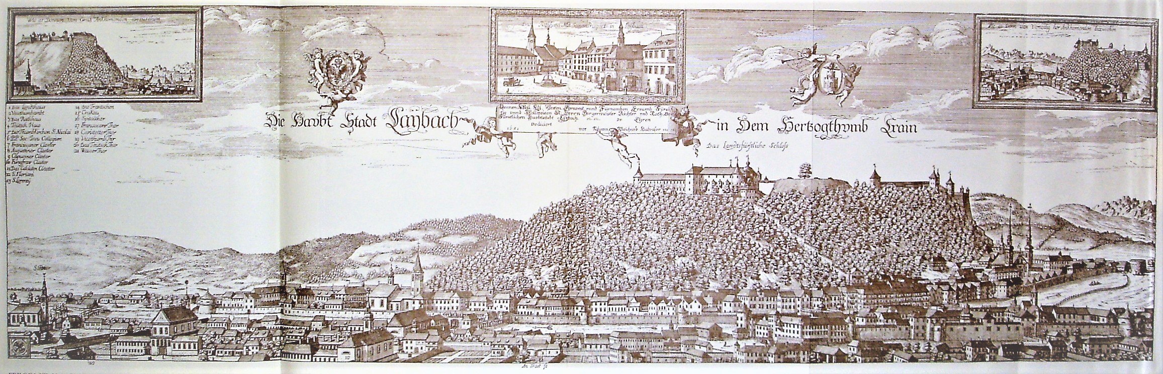 1161년 후반에 쓰여진 것으로 추정되는 양피지 문서 ''Nomina defunctorum''("죽은 자들의 이름")에는 아퀼레이아 총대교구(Patriarchate of Aquileia)의 법률가였던 귀족 루돌프 폰 타르첸토(Rudolf of Tarcento)가 류블랴나 성(Ljubljana Castle, ''castrum Leibach'') 옆에 있는 20개의 농장을 아퀼레이아 총대교구(Patriarchate of Aquileia)에 기증했다는 내용이 기록되어 있다. 역사가 페터 슈티히(Peter Štih)의 추론에 따르면 이 일은 류블랴나에 대한 최초의 기록인 1112년에서 1125년 사이에 일어났다.[39]