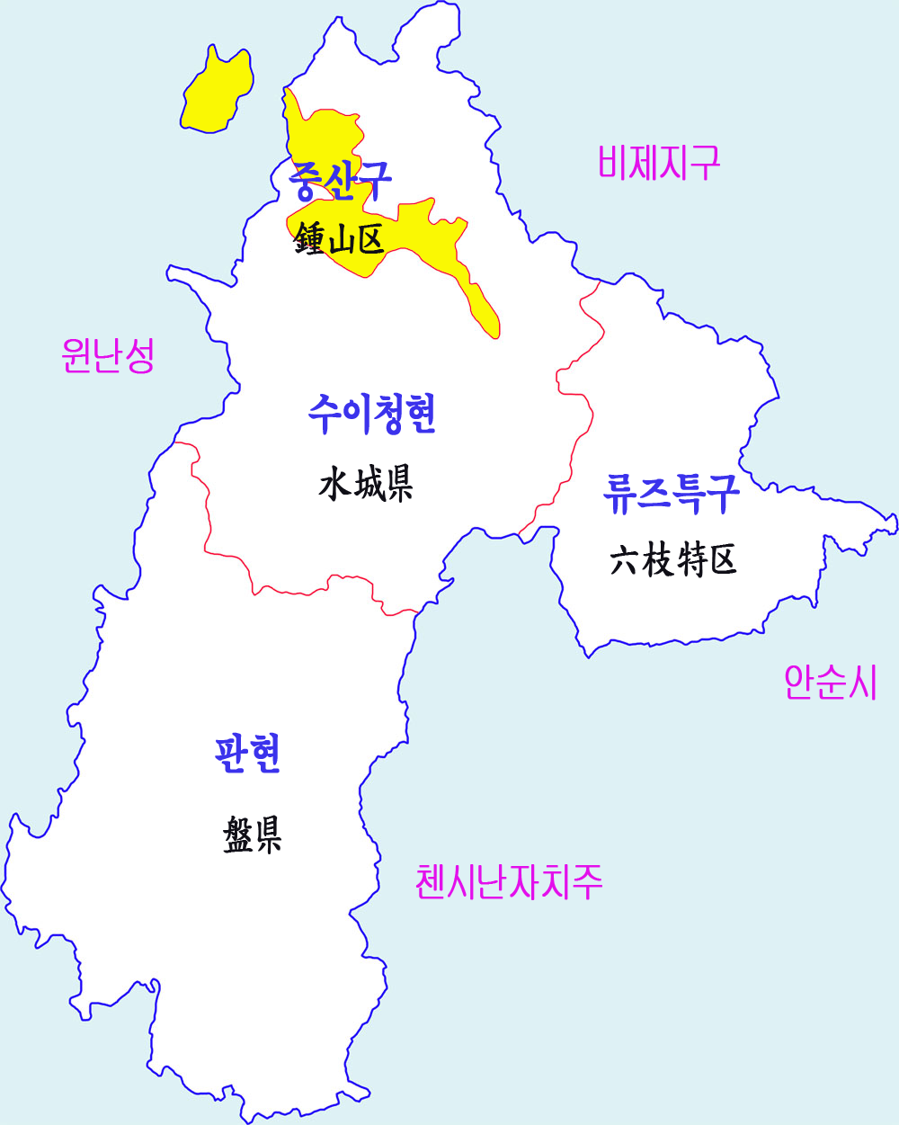류판수이시는 2개의 시할구, 1개의 현급시, 1개의 특구를 관할한다.