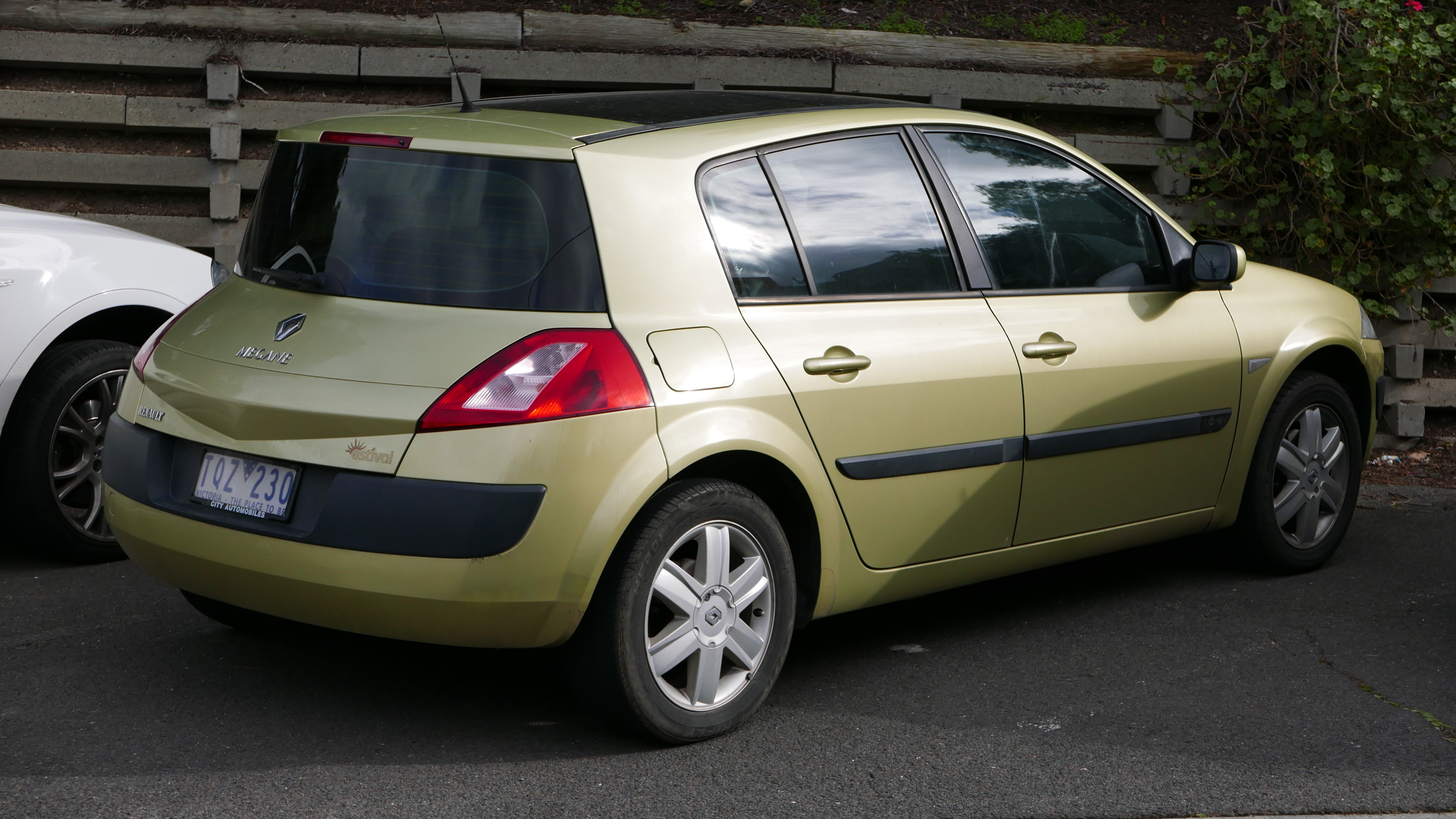 2002년 9월에 2003년형 모델로 출시되어 새로운 시작을 알렸다.[16] 이전 세대와는 디자인 유사성이 거의 없었으며, 아방타임에서 처음 선보인 르노의 새로운 디자인 언어에서 영감을 받았다. 특히 해치백 모델은 거의 수직으로 선 리어 윈도우와 돌출된 테일 게이트 등 독특한 후면 디자인이 특징이었다.[75] 2세대부터 차명의 표기 방식이 소문자 'Megane'에서 대문자를 사용하고 그리스 문자 풍으로 디자인된 'MEGΛNE'으로 변경되었다.[76]