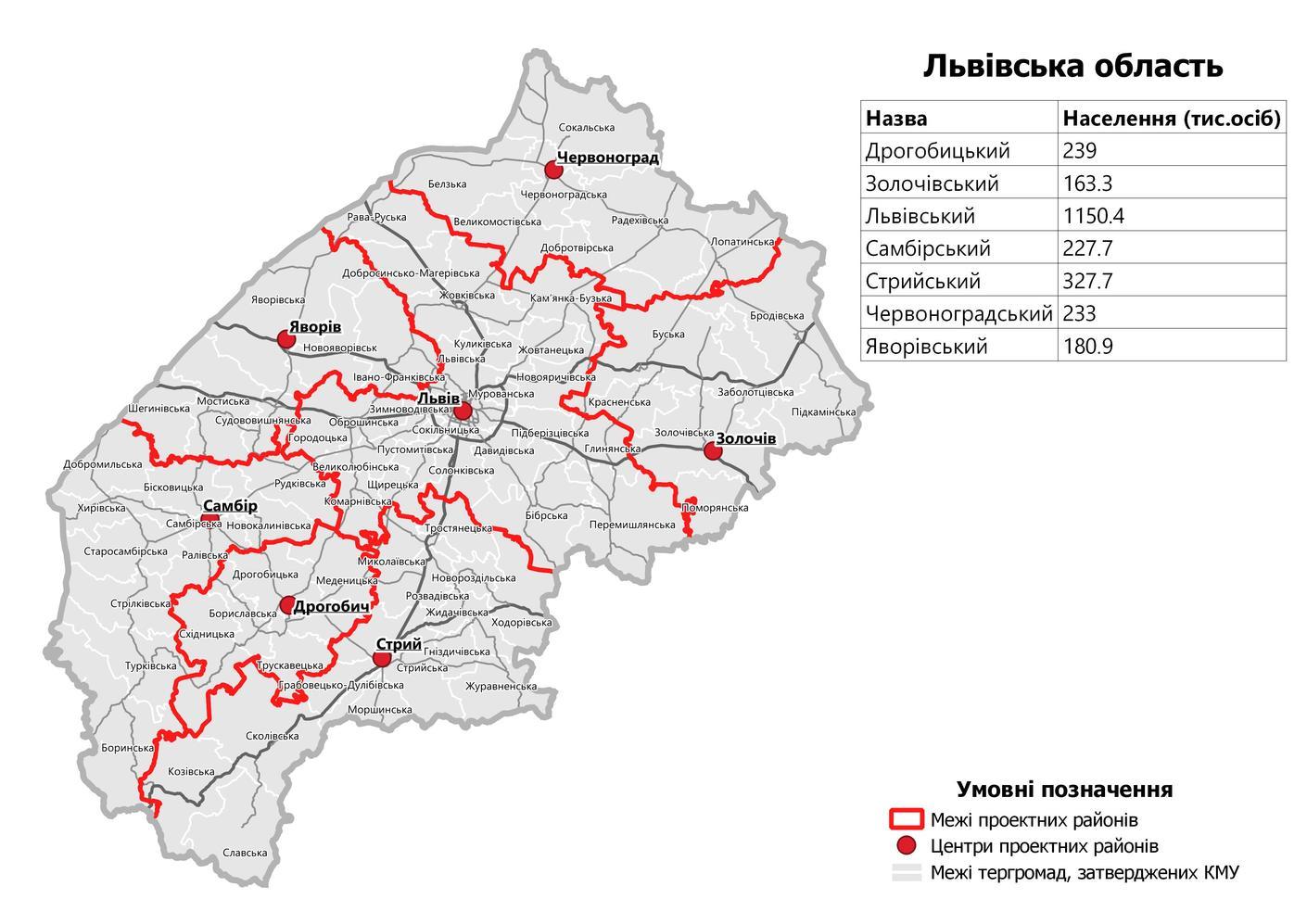 2020년 7월 18일 우크라이나의 대규모 행정 구역 개편 이전까지, 리비우주는 20개의 군(raion)과 주 정부에 직접 속하는 9개의 주 직할시(місто обласного значення)로 구성되어 있었다. 9개 주 직할시는 보리스라우, 체르보노흐라드, 드로호비치, 모르신, 노비 로즈딜, 삼비르, 스트리, 트루스카베츠, 그리고 주의 행정 중심지인 리비우였다.