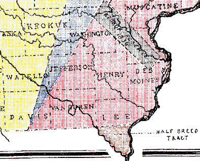 포트 매디슨은 1812년 전쟁으로 거슬러 올라간다. 리 군은 1824년 조약에 의해 설립된 하프브리드 트랙의 위치였다. 이 지역에서는 유럽인 아버지와 인디언 어머니를 둔 아메리카 원주민에게 토지 할당이 이루어졌다. 원래 이 토지는 공동 소유로 유지될 예정이었다. 할당받은 일부 사람들은 더 나은 생계를 꾸리고자 도시에서 살았다. 리 군은 1836년 12월 7일 위스콘신 준주의 관할 하에 명명된 실체로 형성되었다. 1838년 7월 4일에 아이오와 준주가 형성되면서 아이오와 준주의 일부가 되었다.[2] 대규모의 유럽계 미국인 정착은 의회가 소유주에게 토지를 개별적으로 판매하도록 허용한 1839년에 시작되었다. 브리검 영의 지휘 아래 예수 그리스도 후기 성도 교회(LDS 교회)의 회원들은 미주리에서의 박해를 피해 일리노이주와 아이오와주에 정착했다. 노부는 일리노이주 핸콕 군의 국경 너머에 위치해 후기 성도 정착의 주요 중심지가 되었지만, 조셉 스미스의 삼촌인 존 스미스의 지휘 아래 리 군에도 후기 성도 스테이크가 조직되었다. 이 토지는 1839년 아이작 갤런드가 그들에게 판매한 것이었다.2. 2. 후기 성도 운동과 리 군