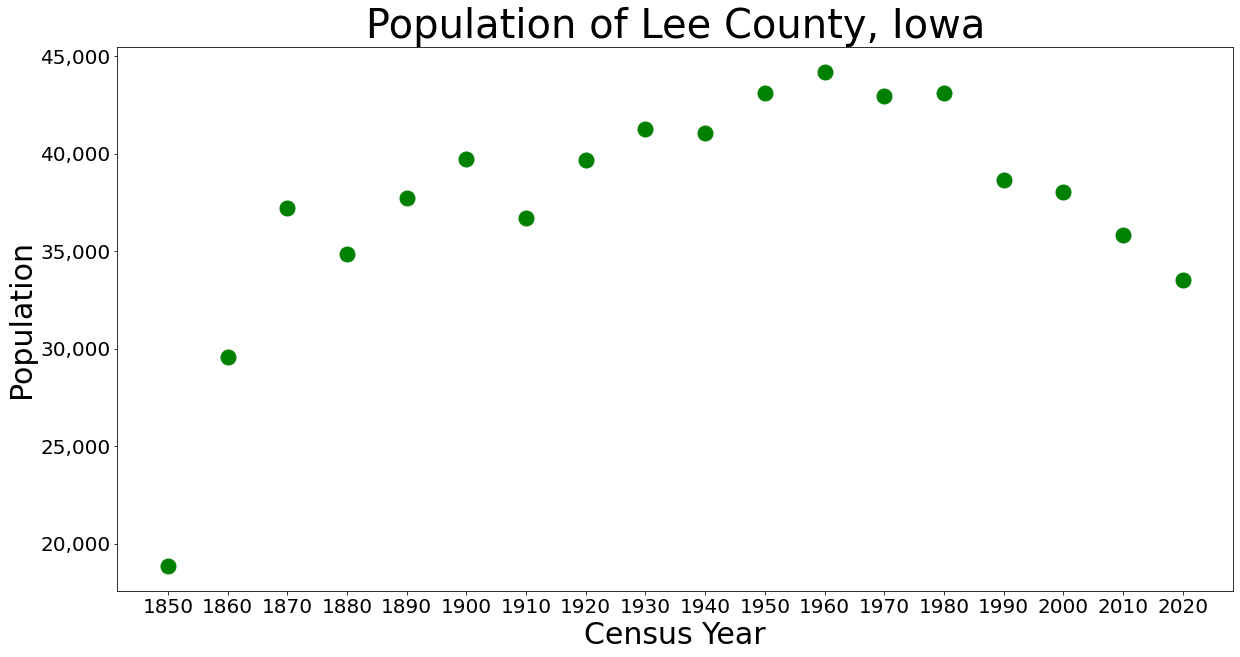리군은 포트 매디슨과 키오쿡 두 곳을 군청 소재지로 두고 있다.[3] 1847년 분쟁으로 인해 두 번째 법원 관할이 생기면서 키오쿡이 설립되었다.[4] 리군의 인구는 1850년 최초의 미국 인구 조사에서 약 19,000명, 1870년에는 37,000명으로 증가했으며, 1960년에 44,000명으로 정점을 찍었다. 이후 지속적으로 감소하여 2020년에는 33,555명이 거주하고 있으며, 이는 1860년과 1870년 사이와 비슷한 수준이다.[9]