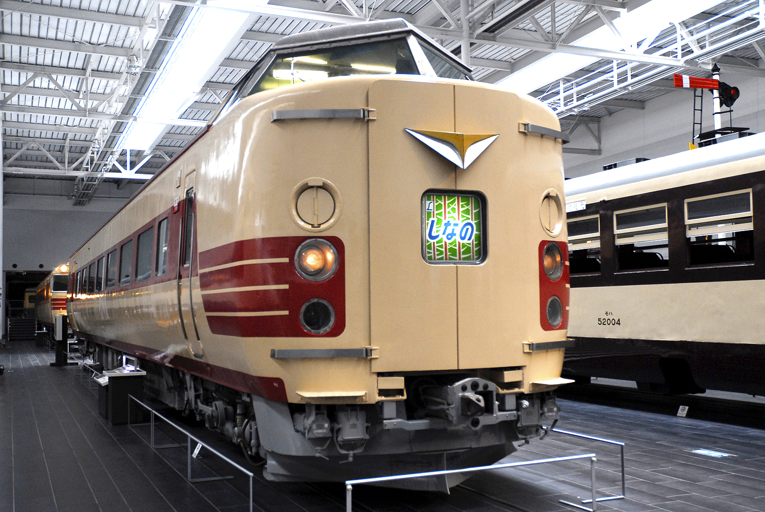 형식 제조년 차량 번호 구 보관 장소 비고 MLX01형 리니어 차량 1995년 MLX01-1 철도종합기술연구소 아이치 엑스포 전시 후 부식 시험 0계 신칸센 전동차 1971년 21-86 하마마츠 공장 1986년 16-2034 하마마츠 공장 그린샤 1975년 36-84 하마마츠 공장 식당차 1983년 37-2523 하마마츠 공장 뷔페차 922형 신칸센 전기·궤도 종합 시험차 1979년 922-26 하카타 종합 차량소 JR 서일본 양도, 보선 관련 전시·비디오 상영 100계 신칸센 전동차 1986년 123-1 하마마츠 공장 X2 편성 1호차 1985년 168-9001 하마마츠 공장 X1 편성 8호차(식당차) 300계 신칸센 전동차 1990년 322-9001 하마마츠 공장 J1 편성 16호차(양산 선행 시제차) 700계 신칸센 전동차 1997년 723-9001 하마마츠 공장 C1 편성 1호차(양산 선행 시제차), 2014년 1월 2일부터 전시 N700계 신칸센 전동차 2005년 783-9001 하마마츠 공장 X0 편성(양산 선행 시제차) 1호차·14호차·8호차(그린샤), 2019년 7월 17일부터 전시 개시, 휴식·음식 공간 2005년 786-9201 2005년 775-9001 955형 신칸센 시험 전동차 1995년 955-6 하마마츠 공장 케90형 경편용 증기 기관차 1918년 케90 나고야 연수 센터 일부 컷 모델 C57형 증기 기관차 1940년 C57 139 나고야 연수 센터 준 철도 기념물, 어전 장비 복원 C62형 증기 기관차 1949년 C62 17 히가시야마 종합공원 ED11형 전기 기관차 1923년 ED11 2 사쿠마 레일 파크 ED18형 전기 기관차 1924년 ED18 2 하마마츠 공장 EF58형 전기 기관차 1958년 EF58 157 하마마츠 공장 포도색 2호 도색 변경 모하 1형 전동차 1922년 モハ일본어 1035 이나마쓰시마 운송구 쿠모하 12형 전동차 1927년 クモハ일본어 12041 이나마쓰시마 운송구 모하 52형 전동차 1937년 モハ일본어 52004 사쿠마 레일 파크 제조 당시 모습 복원 모하 63형 전동차 1947년 モハ일본어 63638 하마마츠 공장 {{lang 복원 111계 전동차 1962년 クハ일본어 111-1 사쿠마 레일 파크 165계 전동차 1963년 クモハ일본어 165-108 미노오타 차량구 1967년 サロ일본어 165-106 하마마츠 공장 381계 전동차 1973년 クハ일본어 381-1 미노오타 차량구 117계 전동차 1982년 クハ일본어 117-30 오가키 차량구 국철색 도색 변경, N700계 전시 전까지 휴식·음식 공간 호지 6005형 증기 동차 1912년 ホジ일본어 6014 박물관 메이지무라 철도 기념물 (일본 유일 증기 동차), 중요 문화재 키하 48000형 기동차 1956년 キハ일본어 48036 사쿠마 레일 파크 키하 80계 기동차 1965년 キハ일본어 82 73 미노오타 차량구 키하 181계 기동차 1968년 キハ일본어 181-1 사쿠마 레일 파크 JR 시코쿠 양도 스니 30형 객차 1929년 スニ일본어 30 95 사쿠마 레일 파크 오야 31형 객차 1937년 オヤ일본어 31 12 사쿠마 레일 파크 오하 35형 객차 1941년 オハ일본어 35 206 사쿠마 레일 파크 마이네 40형 객차 1948년 マイネ일본어 40 7 사쿠마 레일 파크 스하 43형 객차 1954년 スハ일본어 43 321 미노오타 차량구 오로네 10형 객차 1960년 オロネ일본어 10 27 사쿠마 레일 파크 국철 버스 제1호차 (성영 버스) 1930년 - 철도 박물관 철도 기념물 (국철 버스 제1호), 중요 문화재[28] 3. 1. 심볼 존