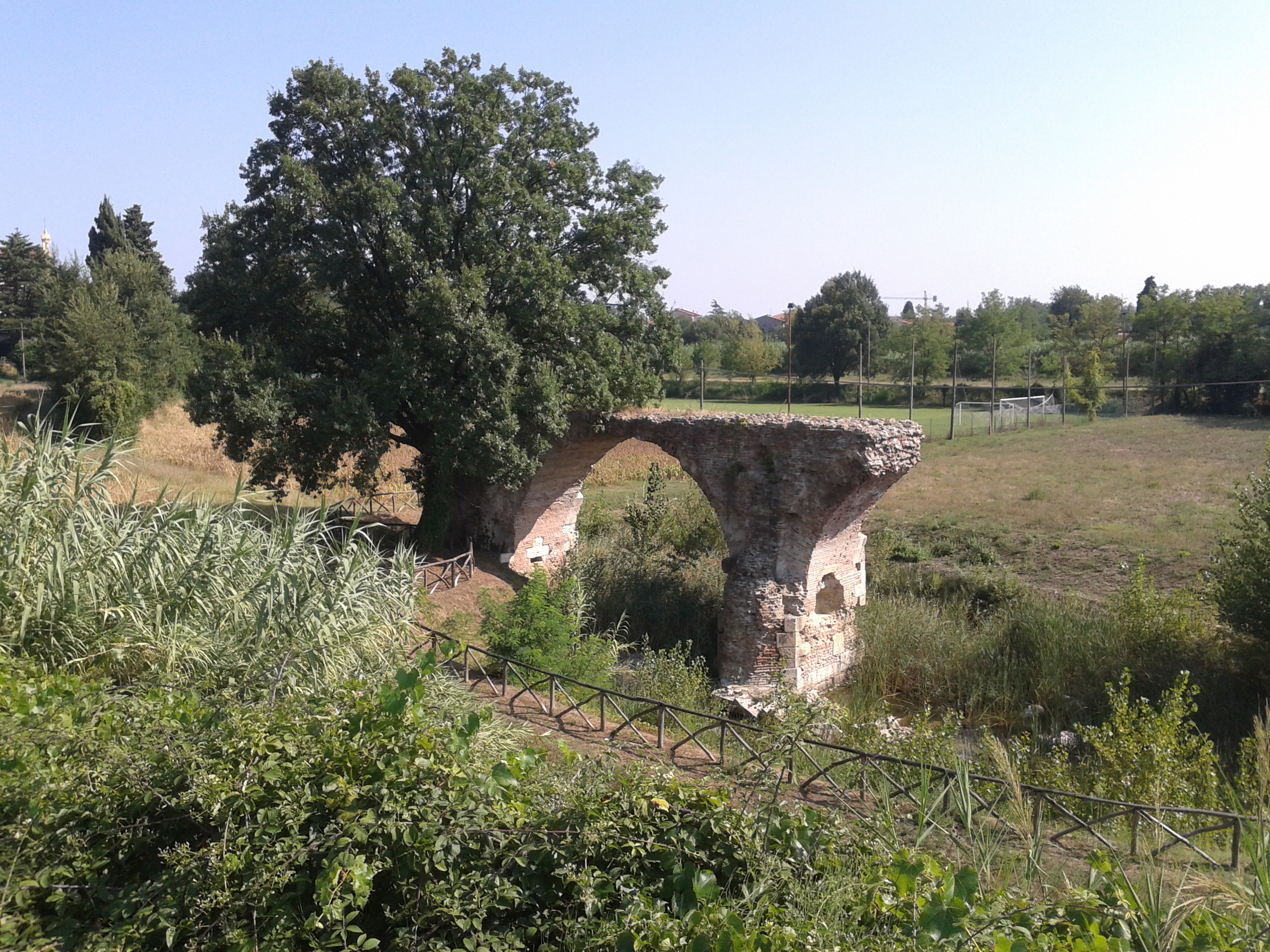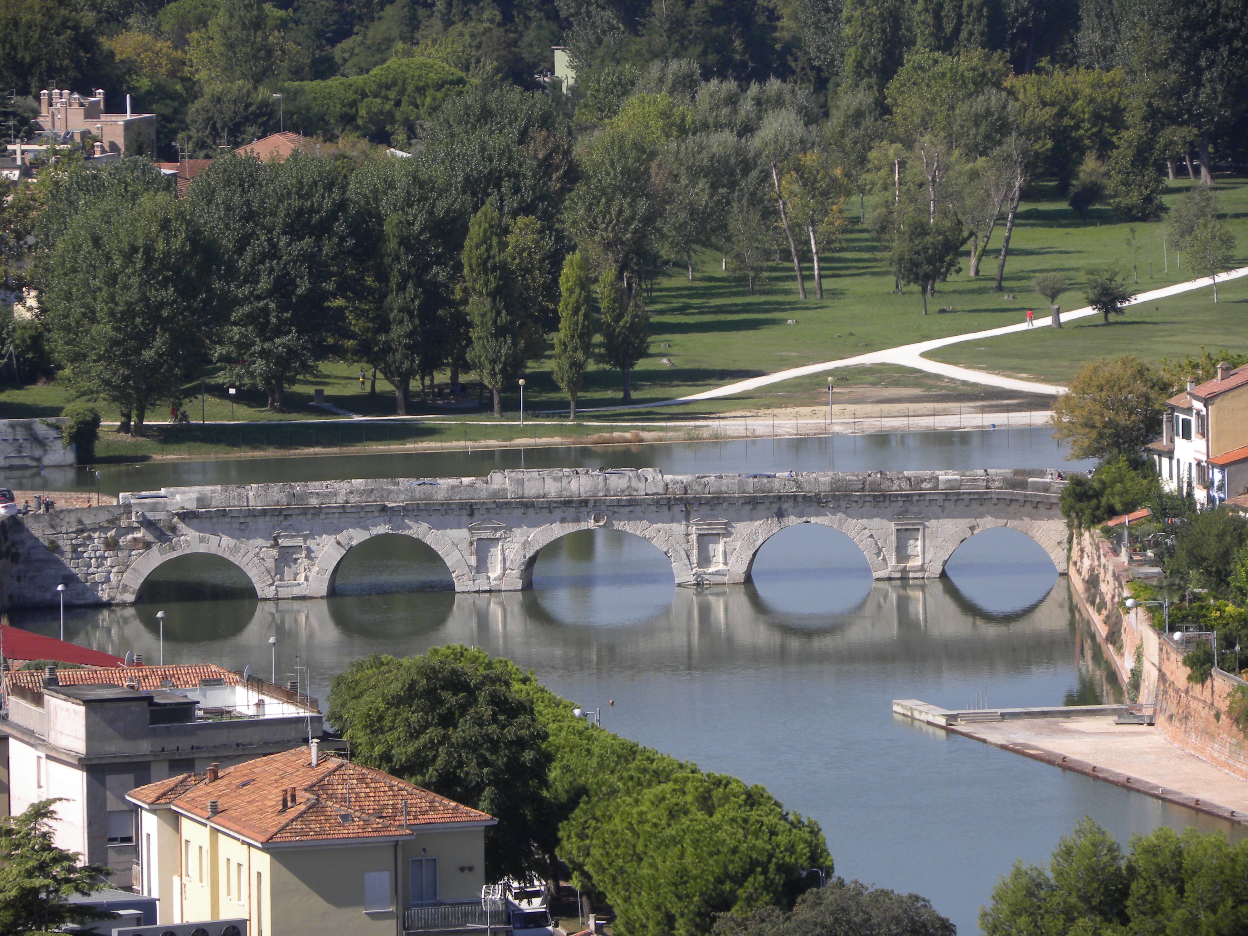 2015년 9월 촬영한 티베리우스 다리의 항공 사진. 리미니 운하 항구 끝에 위치하며, 배경에는 과거 마레키아 강이 흘렀던 4월 25일 공원이 보인다.