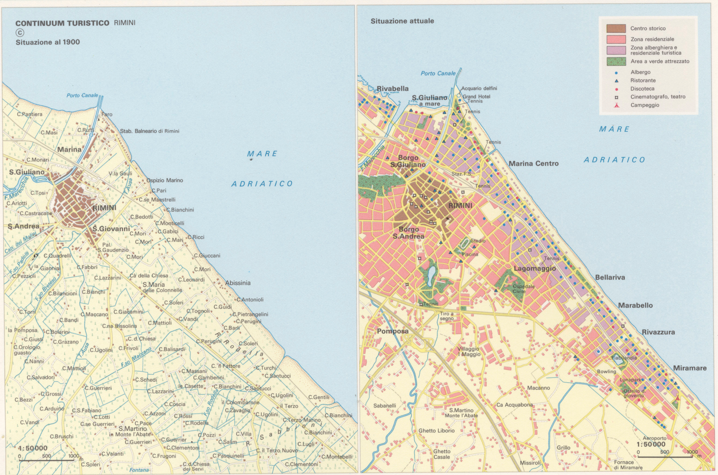 리미니의 고대 해안선은 훨씬 내륙 쪽에 위치해 있었다. 수세기 동안 점진적으로 바깥쪽으로 이동했으며, 20세기 내내 새로운 땅이 개발되었다.[31]