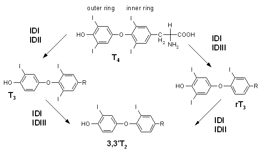 T4 분자에서 아이오딘 원자가 제거되는 탈아이오딘화 반응을 통해 rT3, T3, T2와 같은 다양한 갑상선 호르몬이 생성된다. 이 반응은 체내 갑상선 호르몬 농도를 조절하는 중요한 과정 중 하나이다.