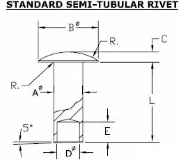 - 반관통 리벳 (Semi-tubular rivets): 팁 부분에 구멍이 있어 설치에 필요한 힘을 줄일 수 있다. 주로 움직임이 필요한 조인트(피벗 포인트)에 사용되며, 설치 장비로는 수동 설정 도구, 수동 압착기, 공압 압착기, 킥 프레스, 충격 리베터, PLC 제어 로봇 등이 있다.