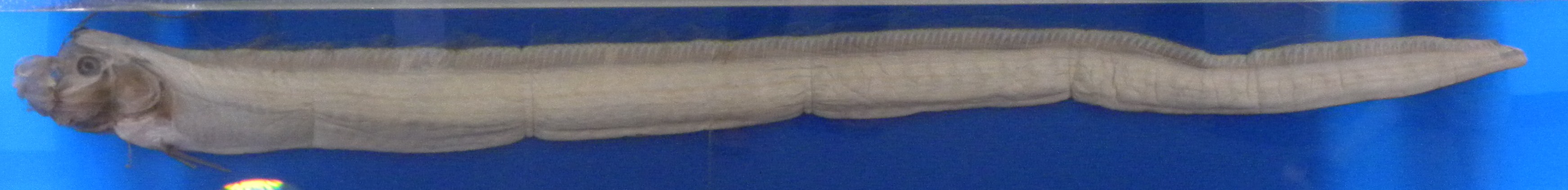 내부 장기는 대부분 몸 앞쪽 머리 부분에 집중되어 있어, 꼬리 부분이 상당히 잘려나가도 생존할 수 있다. 부레는 없다.[12] 간은 주황색 또는 붉은색을 띠는데, 이는 먹이에 포함된 아스타크산틴 때문일 가능성이 높다.[13] 측선은 눈 위쪽 뒤에서 시작하여 몸 아래쪽 1/3 지점으로 내려가 꼬리 끝까지 이어진다.[14] 위(胃) 뒤쪽 복부에는 관 모양의 맹장이 몸 뒤쪽까지 뻗어 있는데, 이 기관의 정확한 기능은 알려져 있지 않으며 생존에 필수적인 것은 아니다.[1] 척추뼈의 수는 143개에서 170개 사이이다.