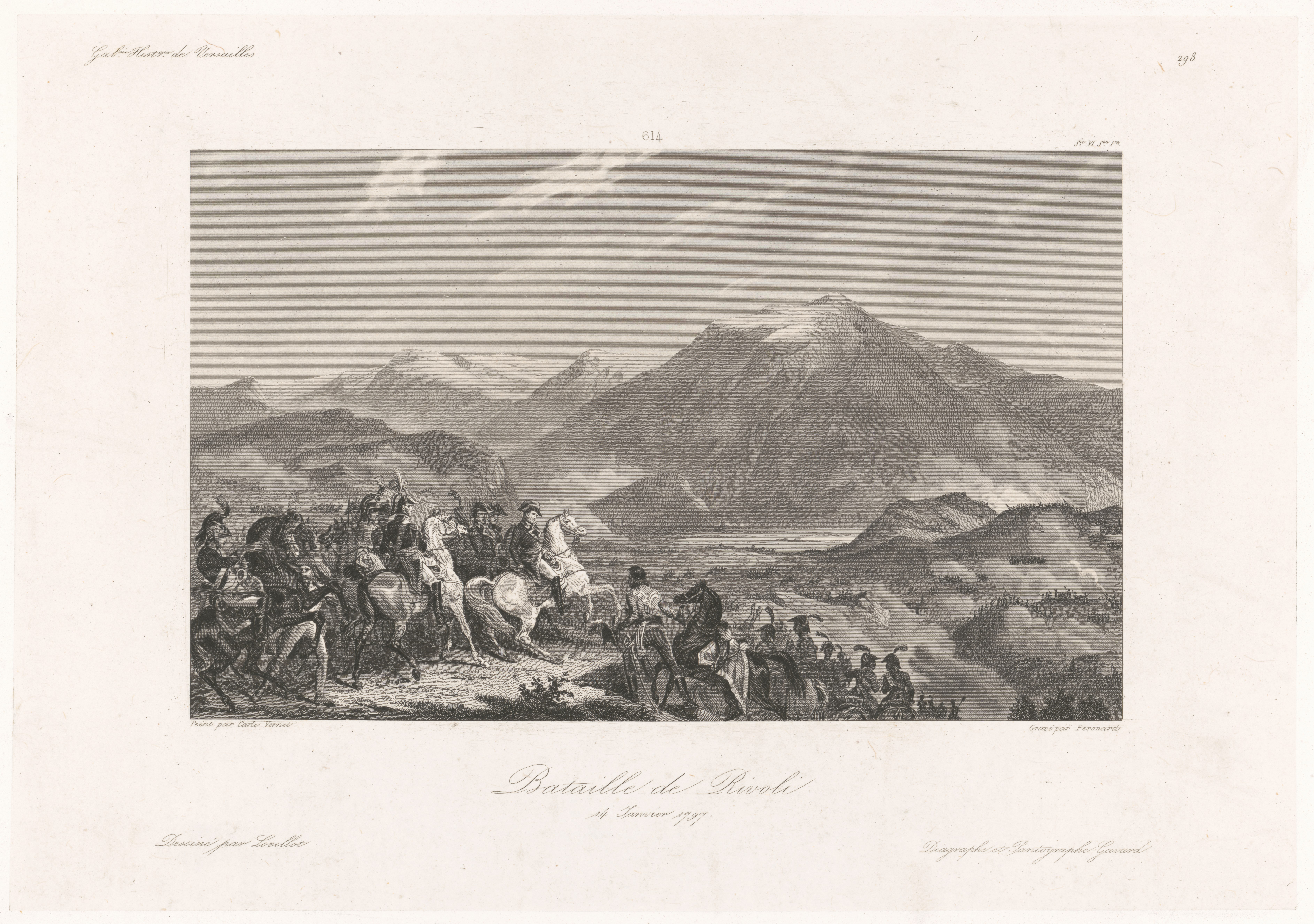 리볼리 전투는 1797년 1월 14일부터 15일까지 나폴레옹 보나파르트가 이끄는 프랑스군과 요제프 알빈치 장군이 지휘하는 오스트리아군 사이에 벌어진 전투이다. 알빈치 장군은 5개 사단으로 나뉜 2만 8천 명의 병력으로 주베르 장군의 프랑스군을 공격하려 했으나, 나폴레옹은 앙드레 마세나의 지원군을 투입하여 트라바소 고지대에 방어선을 구축했다. 프랑스군은 오스트리아군의 전열이 갖춰지지 않은 틈을 타 기병대를 활용한 협공으로 승리했다. 이 전투로 북 이탈리아에 있던 오스트리아군은 궤멸되었고, 나폴레옹은 만토바를 함락시키며 큰 승리를 거두었다.