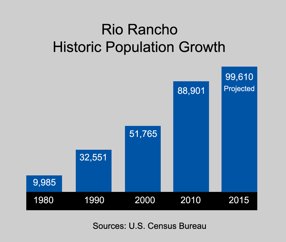2008년 7월 1일 기준, 리오랜초와 앨버커키 도시권의 추정 인구는 각각 79,655명과 845,913명이었다.