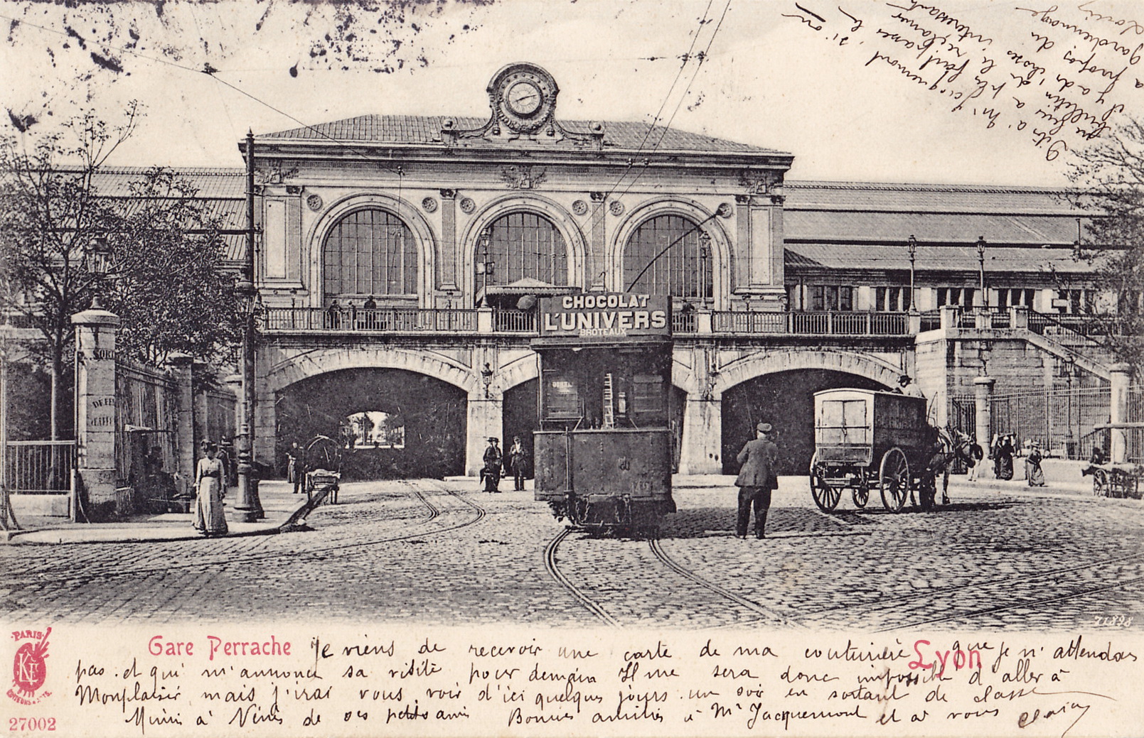 1855년부터 18개월에 걸쳐 프랑수아-알렉시스 샹드리예가 파리-리옹 철도를 위해 역을 건설했다.[1] 처음부터 리옹을 운행하는 세 회사의 노선을 통합하는 중앙역으로 설계되었으며, 역이 개장할 때 이 회사들은 파리-리옹-지중해 철도(PLM)로 합병되었다.[1] 역사는 고전적인 양식으로 지어졌으며, 두 개의 지붕과 넓은 여객 건물이 특징이다.[1][2] 역 앞면에는 리옹-페라쉬에서 출발하는 기차의 행선지 도시 이름이 새겨져 있다.[1] 플랫폼은 두 개의 쌍둥이 철제 지붕으로 덮여 있다.[1][2]