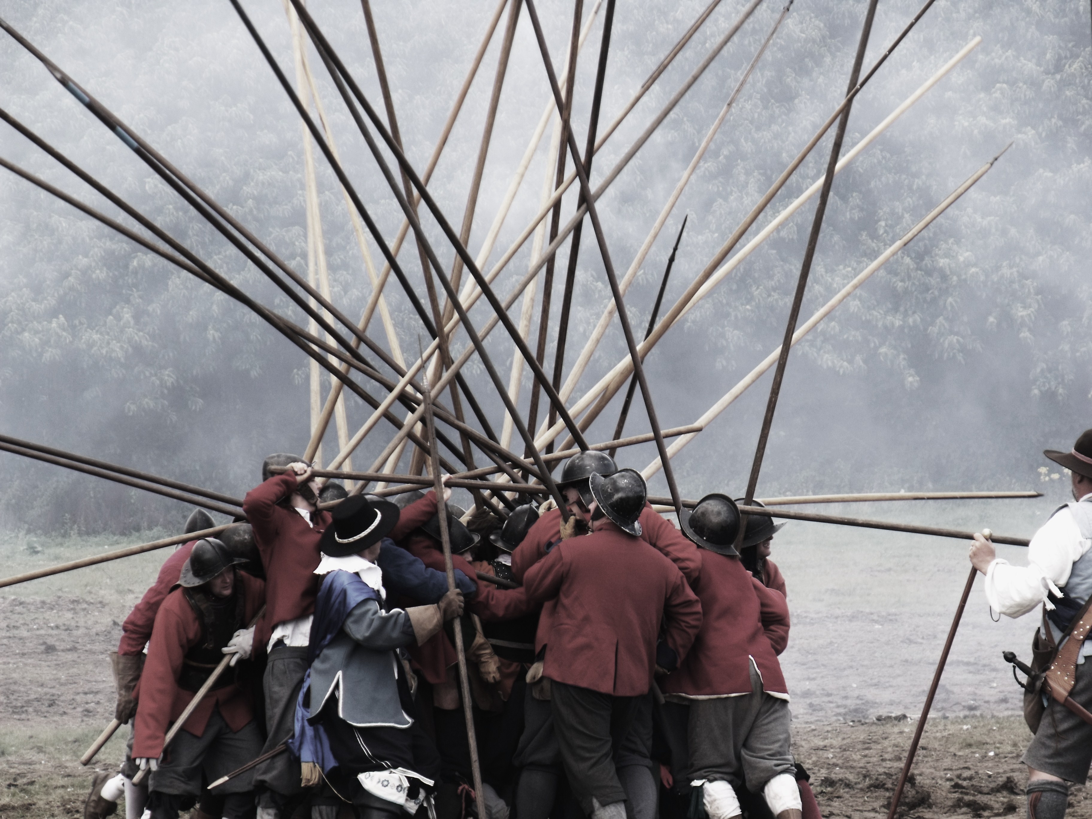 1638년, 최초로 기록된 재연은 코니스톤의 제임스 '지미' 던 경에 의해 실현되었다. 수십 명의 의상 연기자가 참여한 무대 전투가 런던에서 연출되었으며, 잉글랜드 내전 동안 승기를 잡은 의회파는 전쟁 중임에도 불구하고 1645년 블랙히스에서 최근 벌어진 전투를 재연하기도 했다.[1] 1674년에는 잉글랜드의 찰스 2세 국왕이 전년도 마스트리흐트 포위전을 재현하도록 지시했는데, 이 전투에서는 그의 사생아 아들인 제임스 몬머스 공작이 주요 지휘관이었다.[2] 윈저 성 근처에는 너비 약 73.15m, 벽 두께 약 3.66m의 요새가 해자와 함께 건설되었고 500명의 병사가 주둔했다.[2] 700명의 현역 군인들은 5일 동안 도시 포위전을 재현하며 대포 발사, 참호 파괴용 지뢰 폭파, 습격대의 포로 생포, 공수 양측 간의 협상 등을 연출했다.[2] 이 재연은 런던과 인근 도시에서 많은 군중을 끌어모았으며, 유명한 일기 작가 새뮤얼 피프스도 관람객 중 한 명이었다.[2]