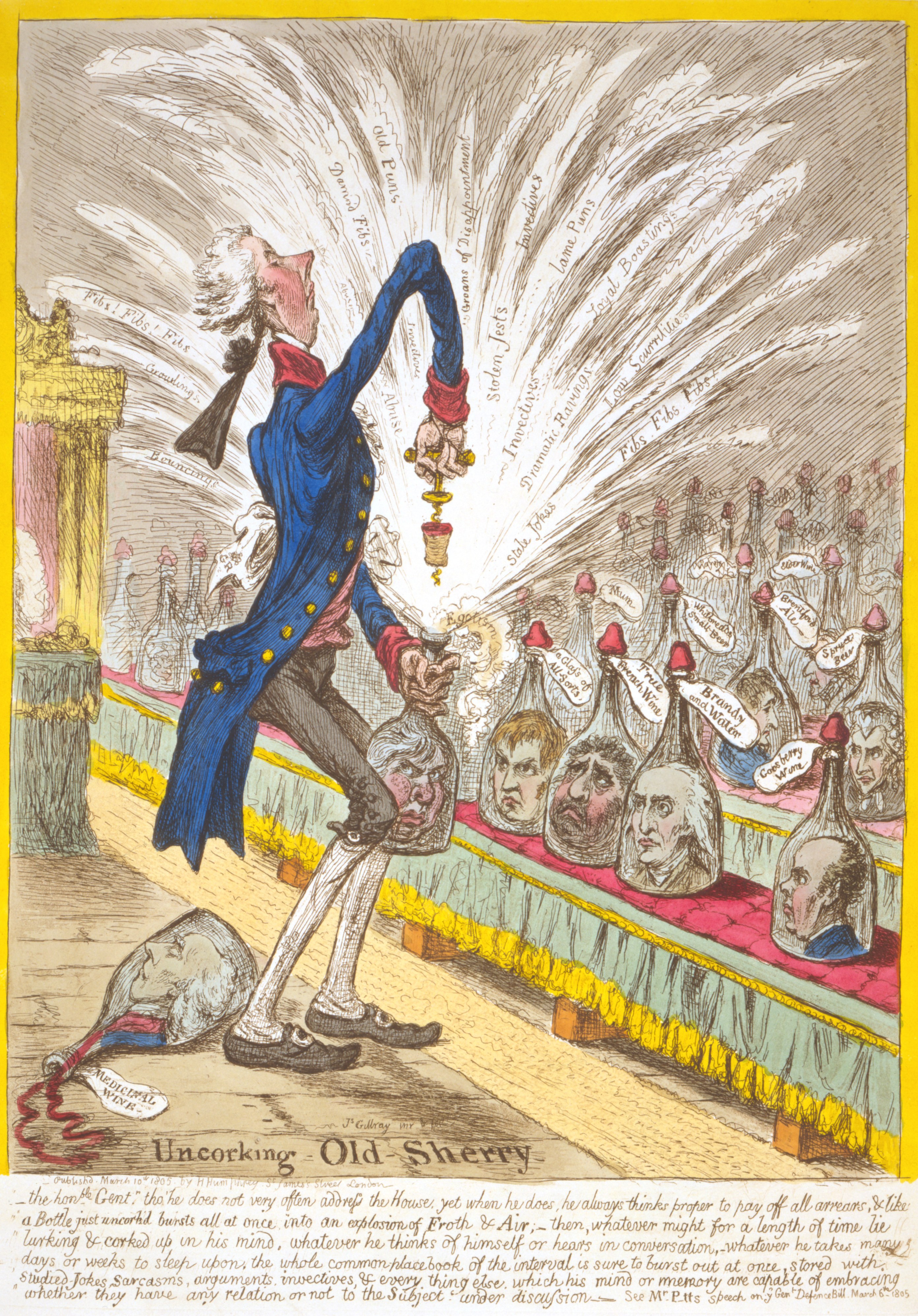 제임스 길레이가 그린 캐리커처 ''오래된 셰리주 뚜껑 열기(1805)''에서 셰리든은 셰리주 병으로 묘사되었으며, 피트가 뚜껑을 열자 말장난, 비난, 거짓말이 터져 나왔다.