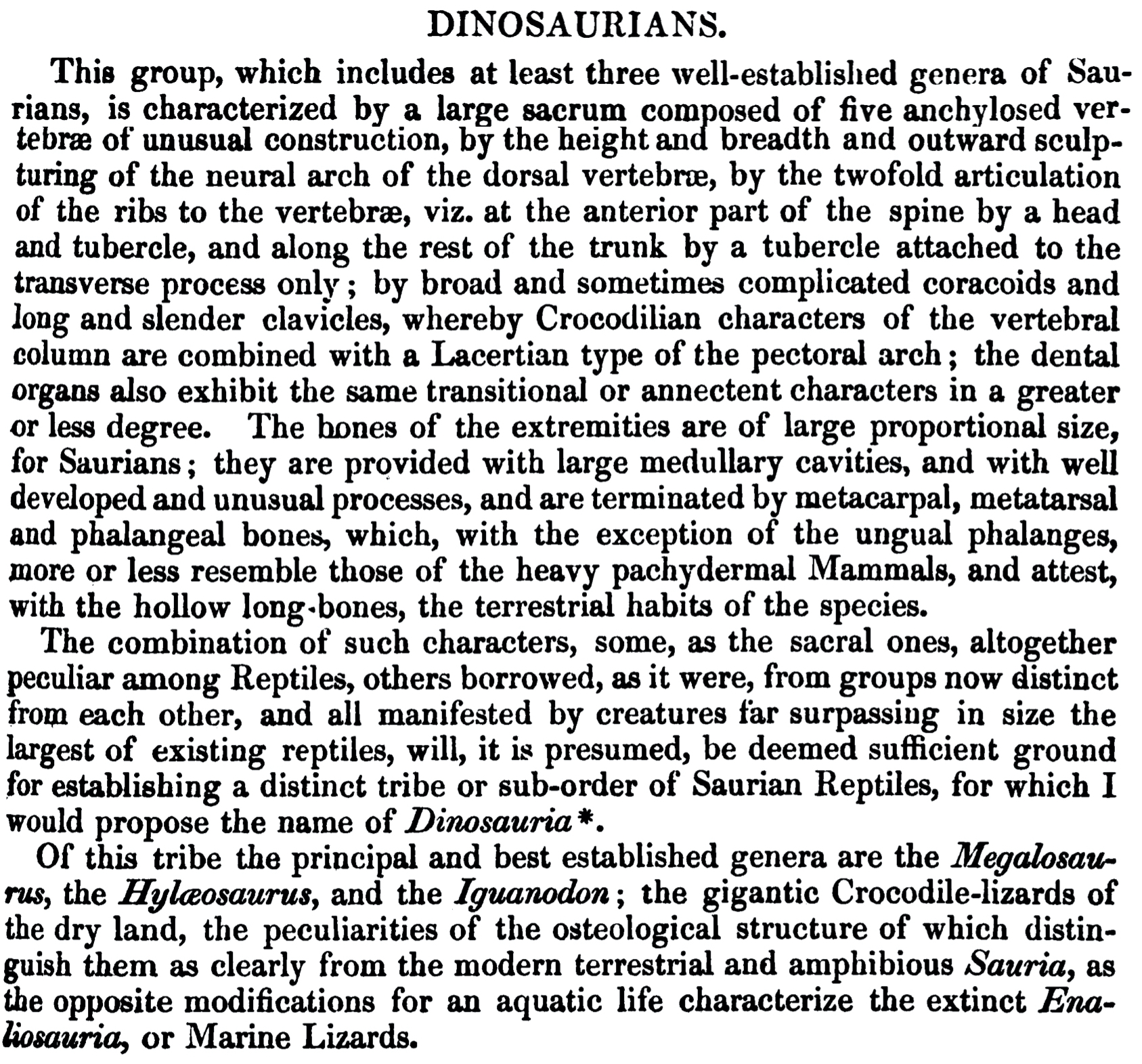 오언의 파충류 연구는 대부분 멸종된 종의 골격에 관한 것이었으며, 그의 주요 논문들은 ''영국 화석 파충류 역사''(4권, 런던 1849-1884)에 재인쇄되었다. 그는 1841년 중생대 육상 파충류 그룹에 대한 최초의 중요한 설명을 발표하고, 공룡(Dinosauria)이라는 이름을 만들었다.[16][2] 오언은 메갈로사우루스(Megalosaurus), 이구아노돈(Iguanodon), 힐레오사우루스(Hylaeosaurus)의 3속을 사용하여 공룡을 정의했다.[2]벤자민 워터하우스 호킨스(Benjamin Waterhouse Hawkins)와 함께 오언은 최초의 실물 크기 공룡 조각상을 만들었다. 일부 모델은 1851년 만국 박람회(Great Exhibition of 1851)를 위해 만들어졌지만, 크리스털 팰리스(the Crystal Palace)가 런던 남부 시든햄(Sydenham, London)으로 이전되면서 33개가 제작되었다. 오언은 1853년 12월 31일 이구아노돈(Iguanodon) 조각상 안에서 21명의 과학자들을 위한 만찬을 열기도 했다. 그러나 1849년, 기디언 만텔(Gideon Mantell)은 이구아노돈이 후피목과 같은 동물이 아니라 가는 앞다리를 가진 동물이라는 것을 깨달았다.[17]