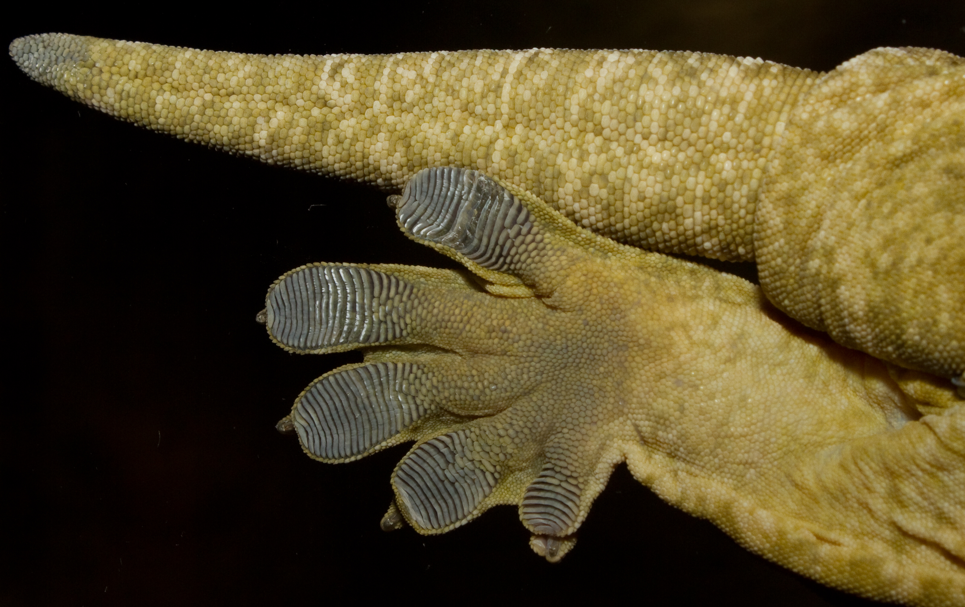발바닥에는 라멜라라고 불리는 미세한 털 구조의 부착 패드가 있어 유리 표면도 수직으로 기어오를 수 있으며, 크고 날카로운 발톱 또한 나무를 타는 데 도움을 준다.[10] 위협을 느끼면 꼬리를 스스로 끊어버리는 자절 행동을 보이며, 잘린 꼬리는 상피 형성 과정을 통해 재생될 수 있다.[6]