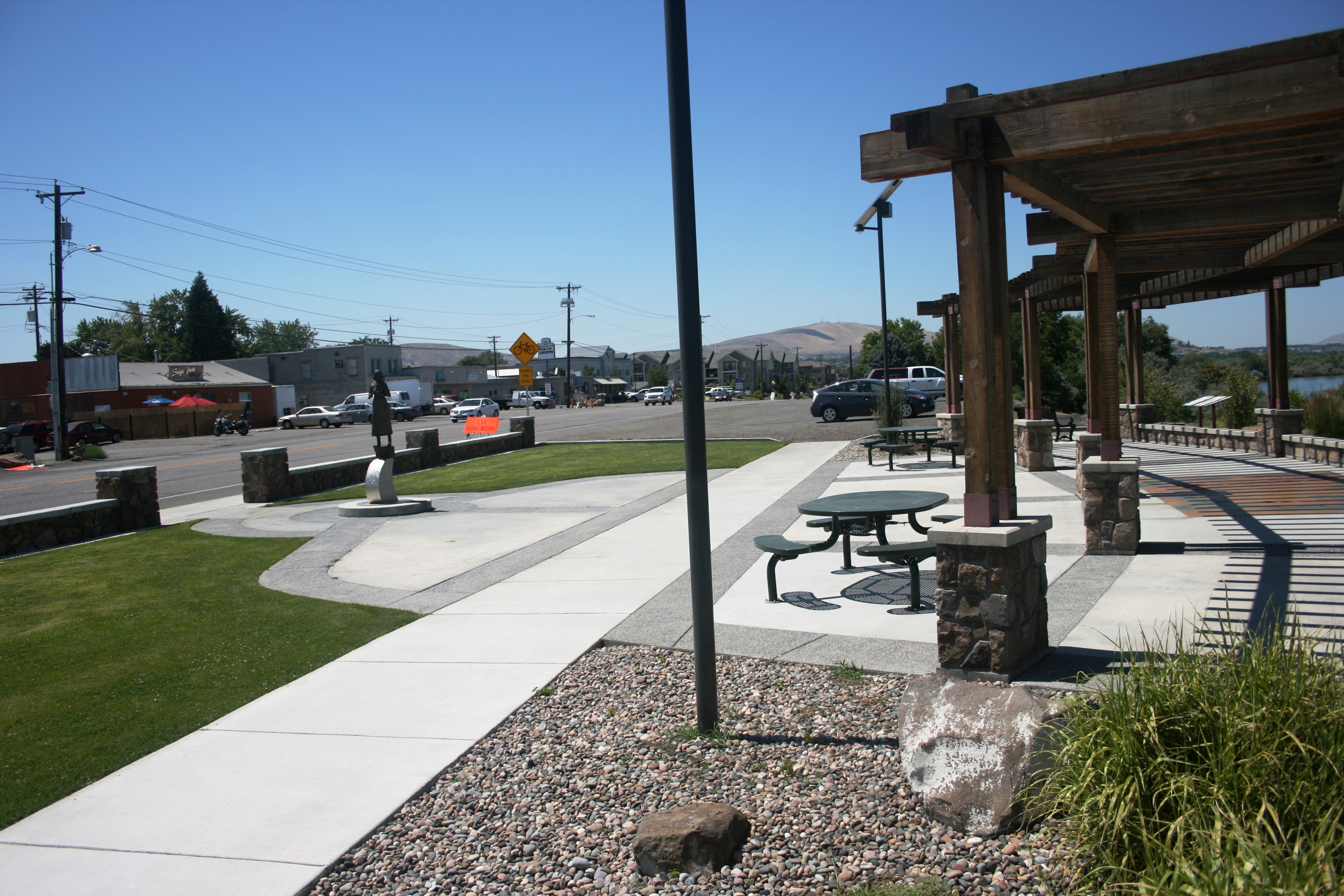 사카자웨아를 기념하는 공원에서 배저 산을 바라본 모습, 상업 지구를 통과함