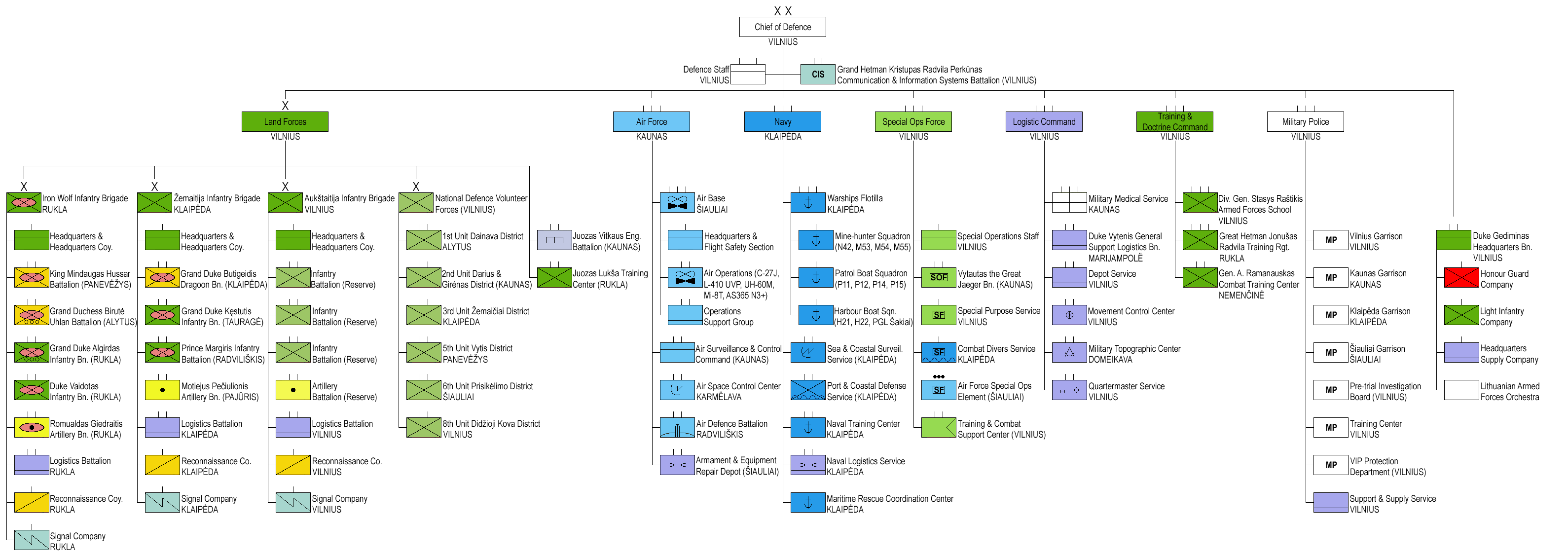 군종 | [[파일:Insignia of the Lithuanian Land Force.svg|25px]] 육군 [[파일:Insignia of the Lithuanian Air Force.png|25px]] 공군 [[파일:Insignia of the Lithuanian Naval Force.svg|25px]] 해군 [[파일:Insignia of the Lithuanian Special Operations Force.png|25px]] 특수작전군 전시: [[파일:Insignia_of_Šaulių_sąjunga.svg|25px]] 소총수 연맹 [[파일:VSTbigLT.png|25px]] 공공안전청 [[파일:Lithuanian_State_Border_Guard_Service_emblem.svg|25px]] 국경 수비대 |