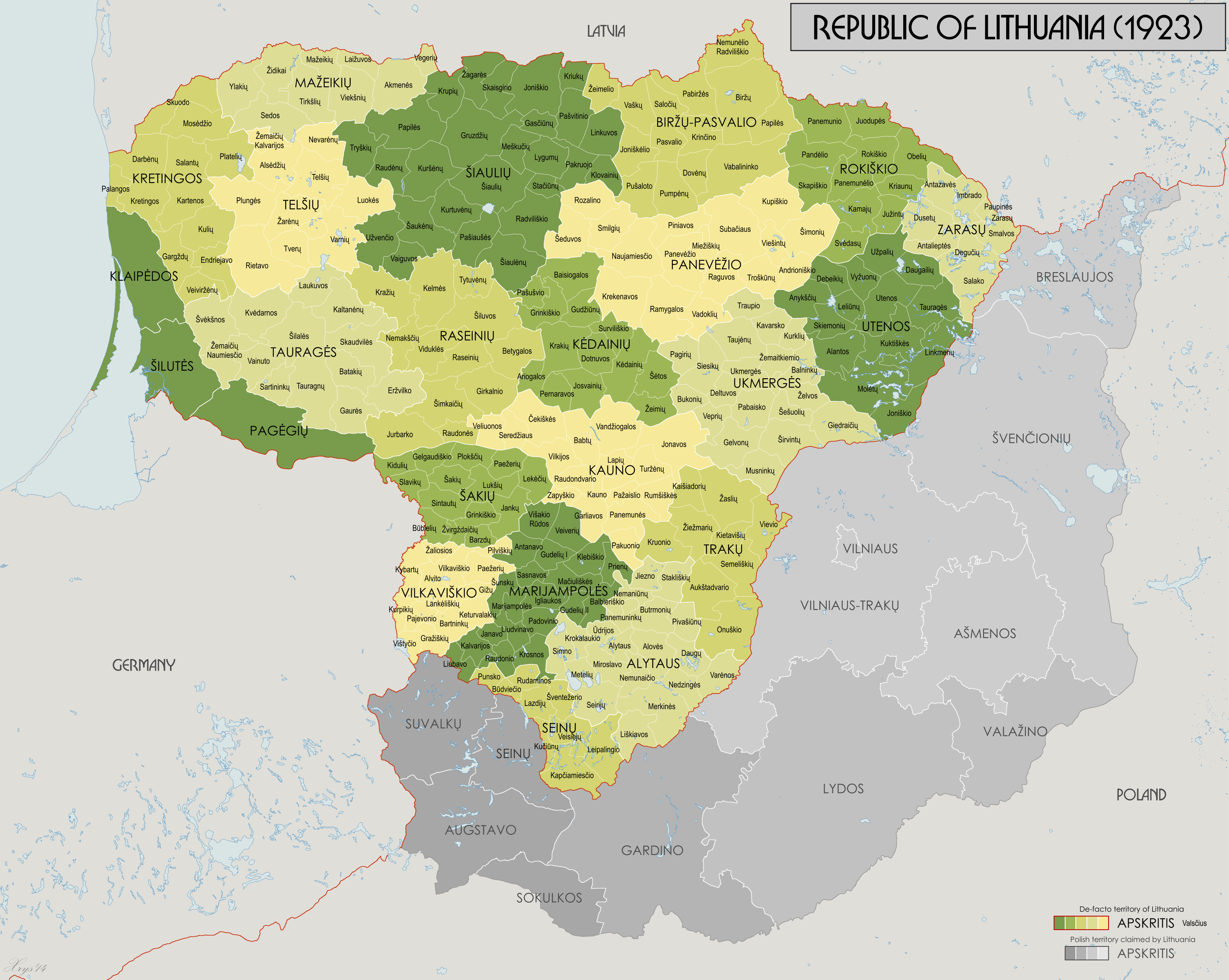 1923년 클라이페다 지역을 획득한 후, 이 지역은 세 개의 현(클라이페다, 실루테, 파게게이)으로 나뉘었다.[10] 이로써 리투아니아의 현은 총 23개가 되었고, 이 체제는 1939년까지 유지되었다. 1931년에 통과된 법에 따라 11개의 주요 도시는 현 행정부로부터 독립하여 자체 정부를 갖게 되었다.[8] 1939년 3월, 1939년 독일의 리투아니아에 대한 최후통첩으로 인해 리투아니아는 세 개의 현을 포함하는 클라이페다 지역을 독일에 넘겨주었다. 같은 해 10월, 소련은 리투아니아 내 붉은 군대 주둔을 허용하는 대가로 빌뉴스 지역의 5분의 1을 리투아니아에 반환했다. 새로 얻은 빌뉴스 지역은 세 개의 현(빌뉴스, 에이시슈케스, 슈벤초넬랴이)으로 나뉘었다.[9] 결과적으로 1939년 말 리투아니아는 다시 23개의 현을 보유하게 되었다.