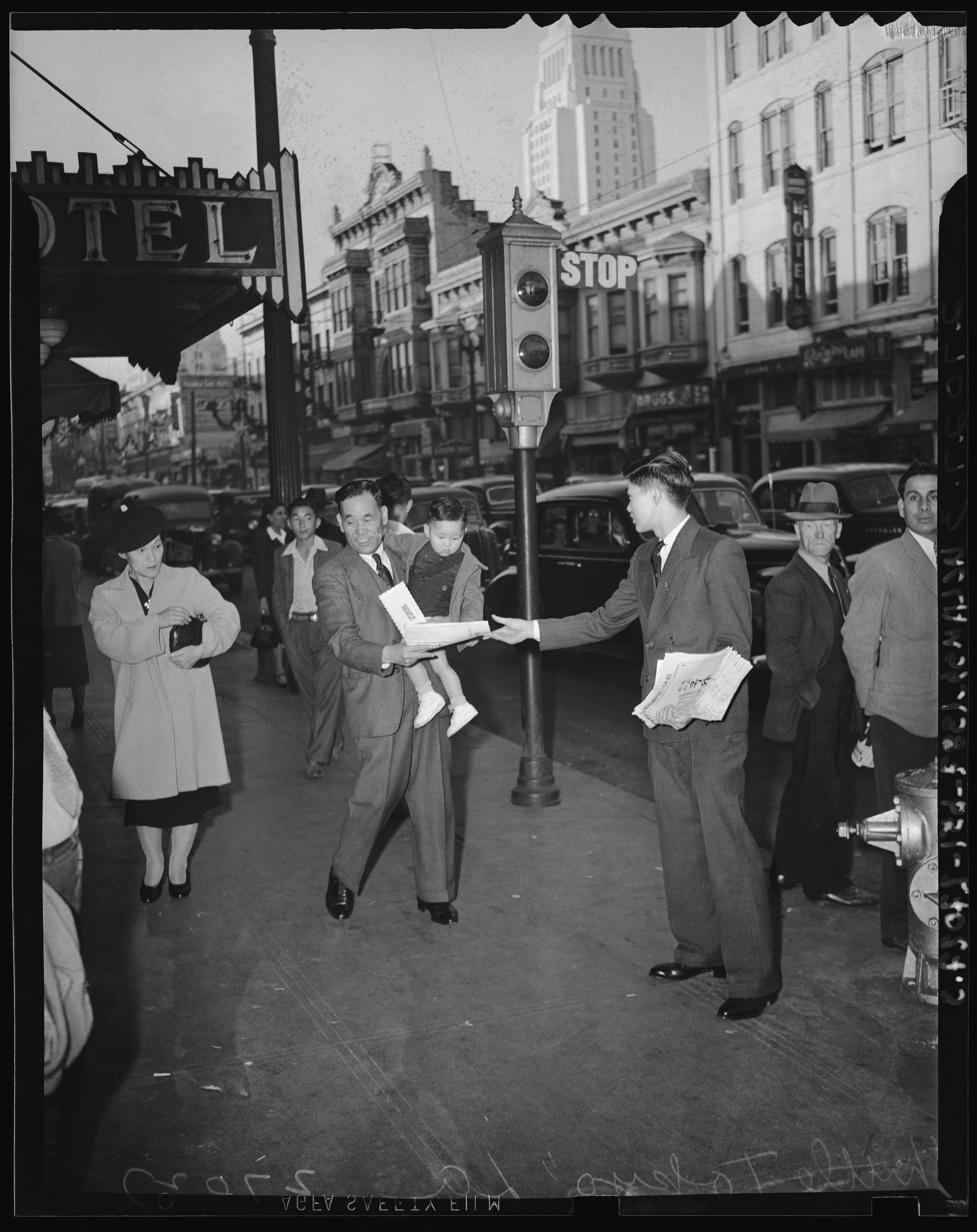 1941년, 리틀도쿄는 약 3만 명의 일본계 미국인이 거주하며 인구의 정점을 찍었으나, 같은 해 진주만 공습이 발생하면서 이러한 성장은 멈추게 되었다. 1941년 12월 미국과 일본 사이에 전쟁이 시작되자, 인종 차별을 배경으로 한 정부 명령이 시행되어 미국 내 모든 일본계 미국인들은 강제 수용되었고 재산도 몰수당했다. 이로 인해 제2차 세계 대전 중 리틀 도쿄는 거의 텅 비게 되었다.[13]1942년부터 도시의 일본계 인구가 일계 미국인 강제 수용소로 강제 이주된 후, 미국 남부에서 온 많은 아프리카계 미국인들이 노동력이 부족한 방위 산업 일자리를 찾아 로스앤젤레스로 이주했다. 이는 제2차 대이동의 일부였으며, 약 8만 명에 달하는 새로운 이주민들이 리틀 도쿄에 정착했다. 이는 전쟁 전 리틀 도쿄 인구의 거의 세 배에 달하는 수치였다. 이 시기 동안 아프리카계 미국인뿐만 아니라 미국 원주민과 라틴 아메리카인들도 비어 있는 건물로 이주하여 나이트클럽, 식당 등 사업체를 열면서, 이 지역은 잠시 '브론즈빌(Bronzeville)'이라는 이름으로 알려졌다. 일부 아프리카계 미국인 사업가들은 상공 회의소를 설립하고 공식 명칭 변경을 추진하기도 했다.