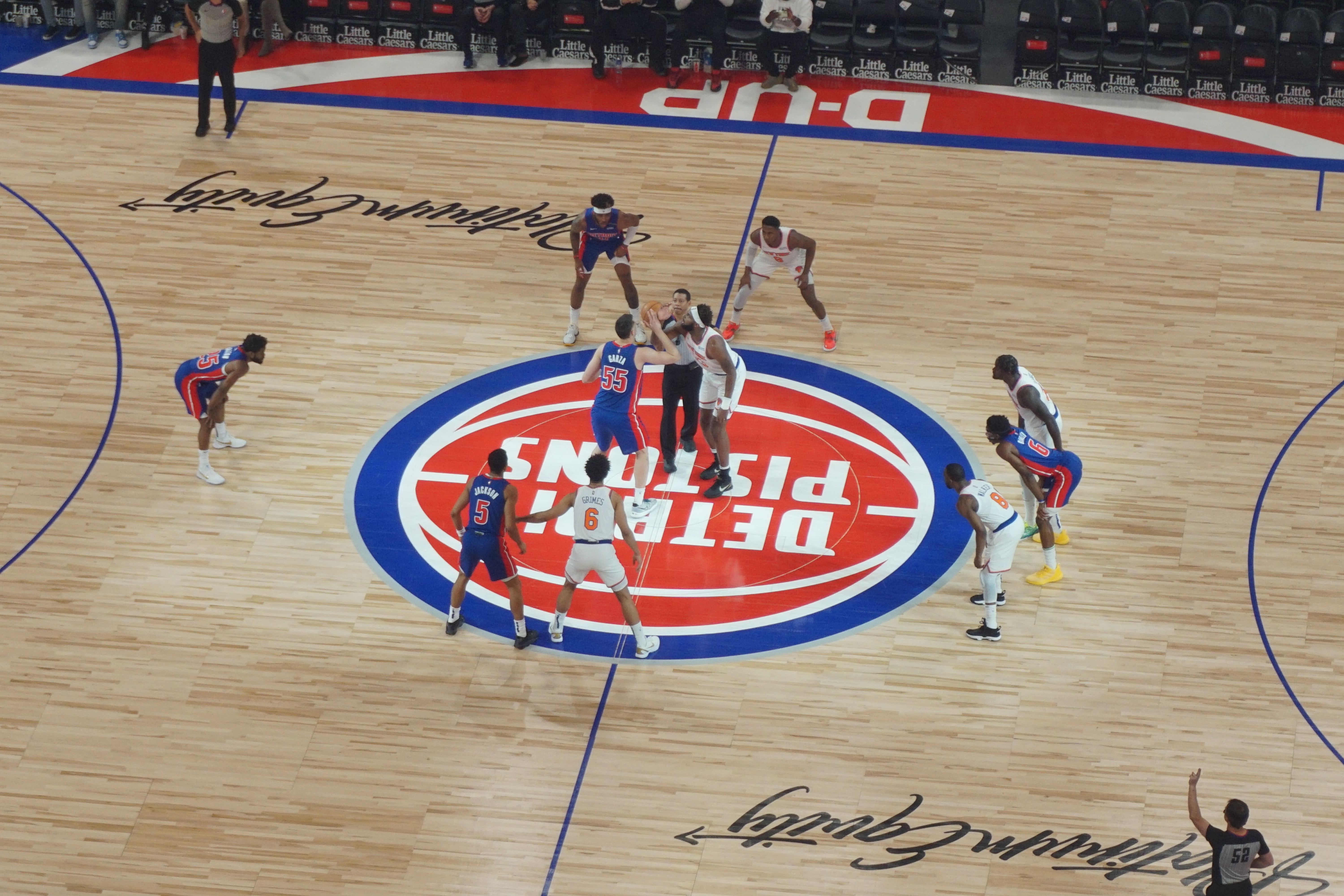 리틀 시저스 아레나로 이전하면서, 피스톤스는 경기장 로고 대신 스폰서인 플래티넘 에쿼티 로고가 새겨진 새로운 농구 코트를 공개했다. 이로 인해 피스톤스는 코트에 경기장 관련 표시를 전혀 하지 않는 유일한 NBA 팀이 되었다.[68]
