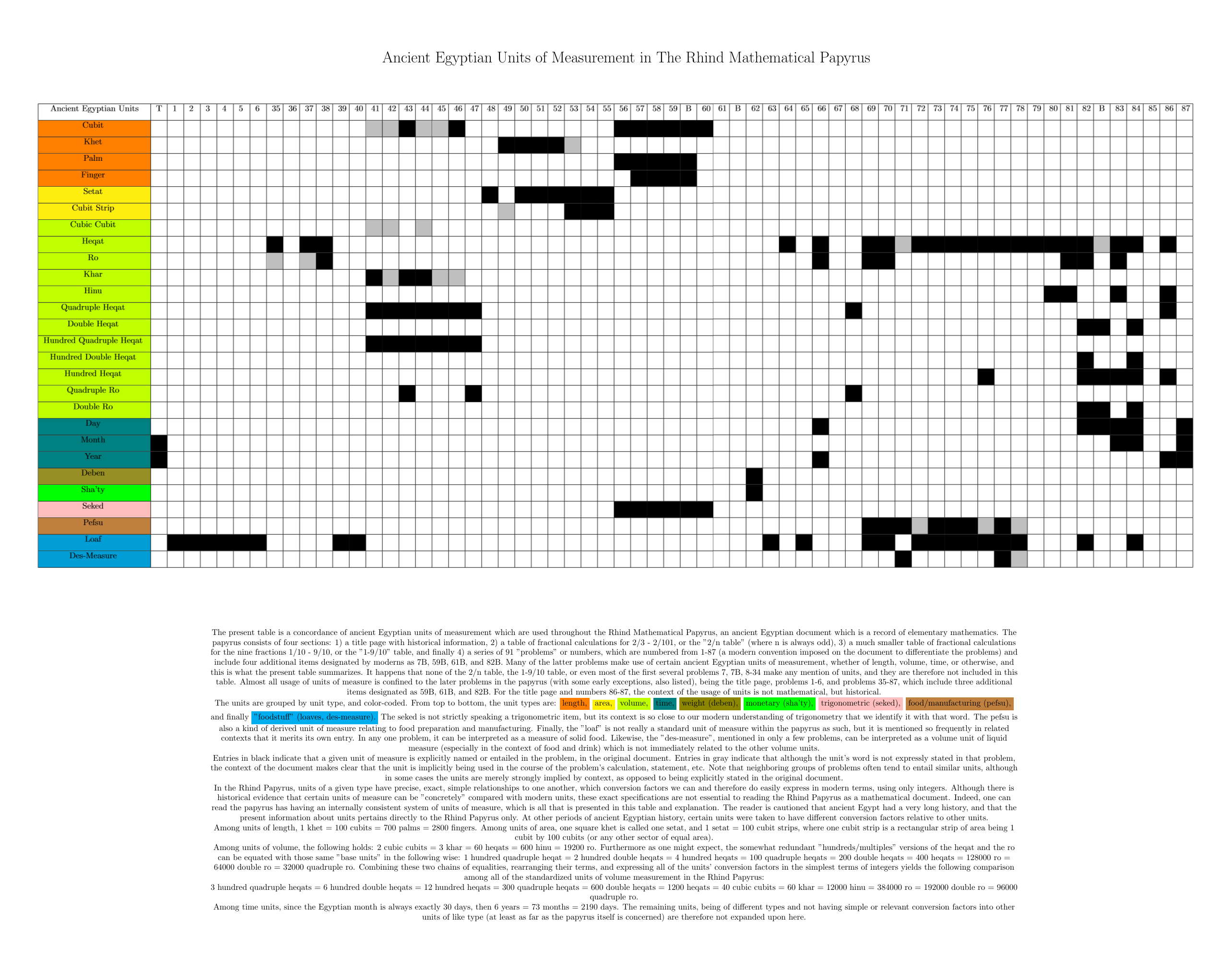린드 수학 파피루스에서는 주로 부피를 나타내는 단위들이 사용되었으며, 이들 간의 변환이 중요하게 다루어졌다. 특히 문제 47에서는 "100 쿼드러플 헤카트"를 10부터 100까지 10의 배수로 나누는 상황을 통해 다양한 부피 단위를 보여준다. 여기서 사용된 단위들은 다음과 같은 관계를 갖는다.[7]