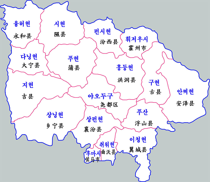 3 | 훠저우 시 | 霍州市중국어 | Huòzhōu Shì | 765km2 | 282,907 | 370 | |