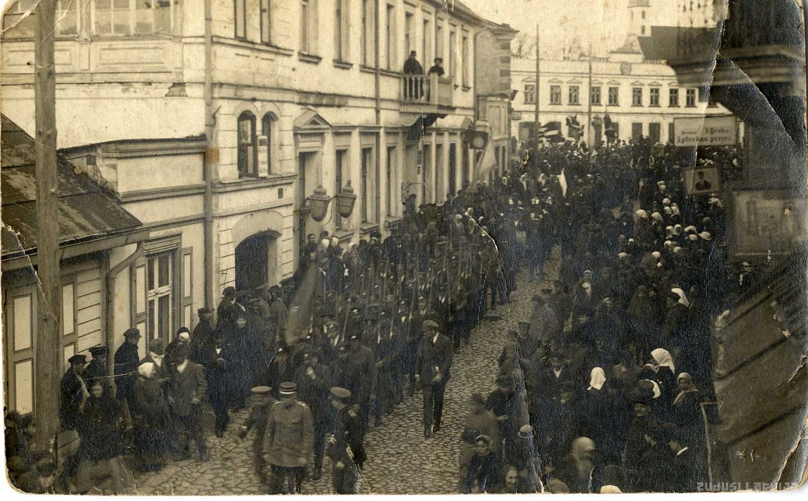 1919년 림바지의 유라스 거리에서 라트비아 임시 정부에 의해 동원된 병사들의 행진